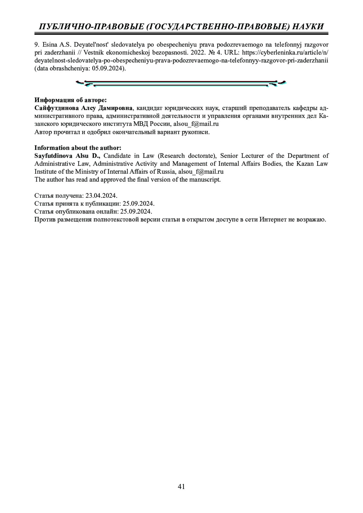 9. 	Есина А.С. Деятельность следователя по обеспечению права подозреваемого на телефонный разговор при задержании // Вестник экономической безопасности. 2022. № 4. URL: https://cyberleninka.ru/article/n/deyatelnost-sledovatelya-po-obespecheniyu-prava-podozrevaemogo-na-telefonnyy-razgovor-pri-zaderzhanii (дата обращения: 05.09.2024). EDN: BMOTLW