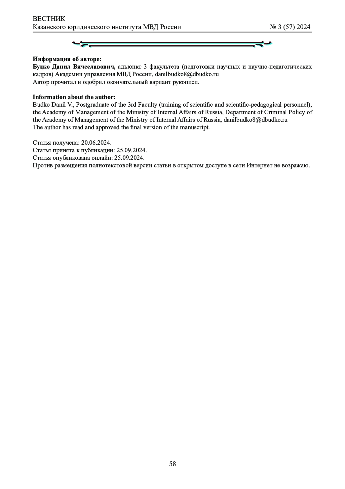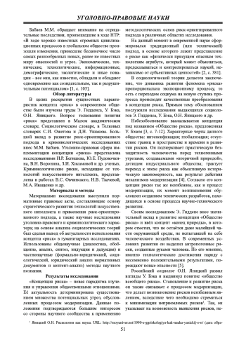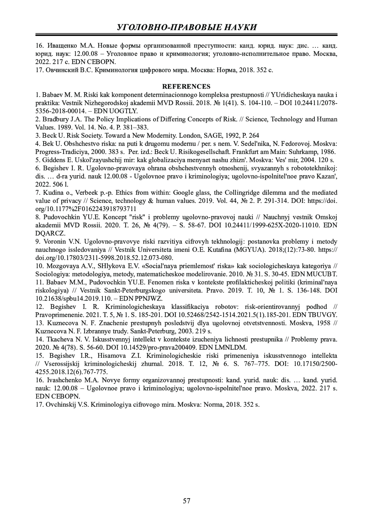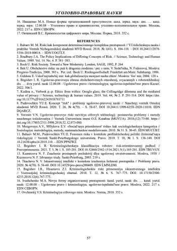 1. Бабаев М. М. Риски как компонент детерминационного комплекса преступности // Юридическая наука и практика: Вестник Нижегородской академии МВД России. 2018. № 1(41). С. 104-110. DOI: 10.24411/2078-5356-2018-00014 EDN: UOGTLY
