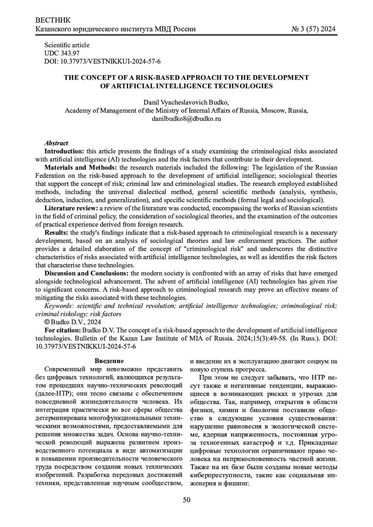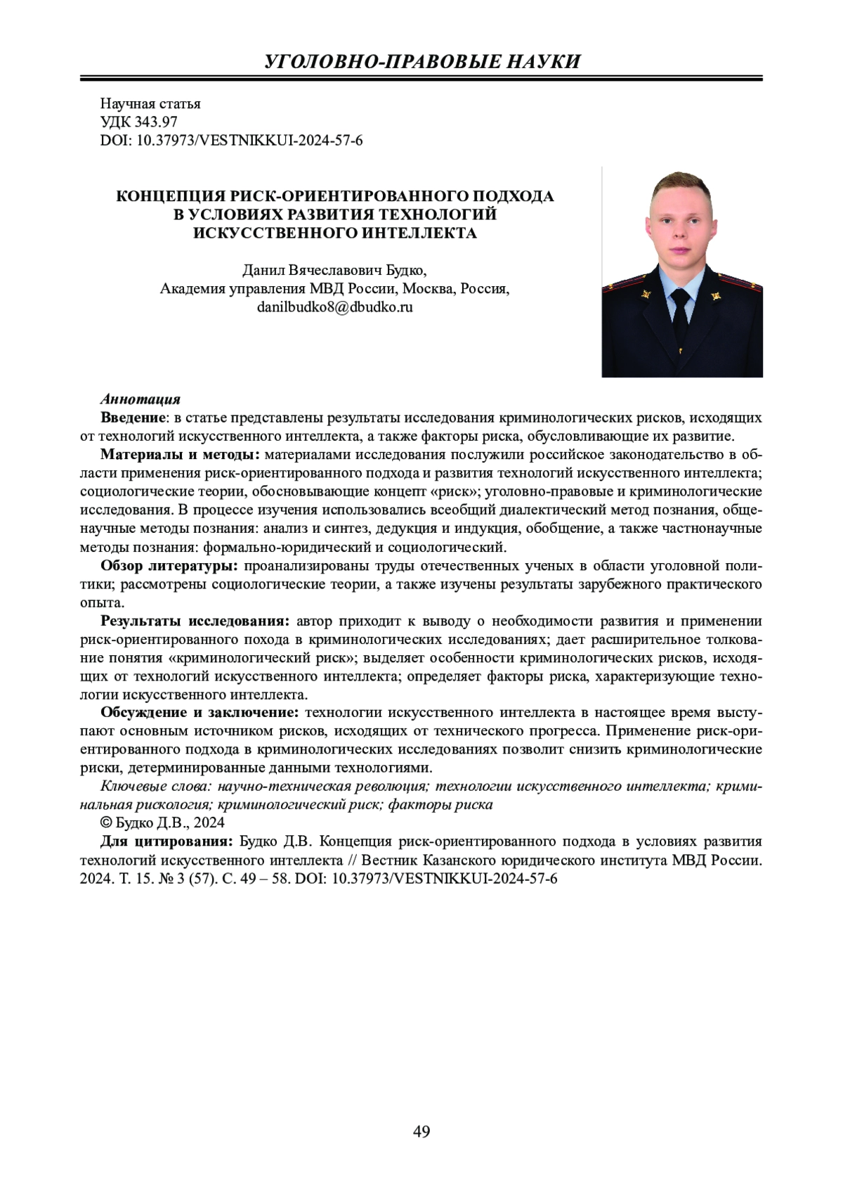 Обсуждение и заключение: технологии искусственного интеллекта в настоящее время выступают основным источником рисков, исходящих от технического прогресса. Применение риск-ориентированного подхода в криминологических исследованиях позволит снизить криминологические риски, детерминированные данными технологиями.