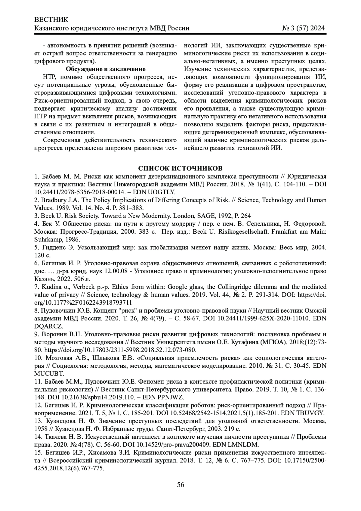 15. Бегишев И.Р., Хисамова З.И. Криминологические риски применения искусственного интеллекта // Всероссийский криминологический журнал. 2018. Т. 12, № 6. С. 767-775. DOI: 10.17150/2500-4255.2018.12(6).767-775 EDN: YYSTVZ