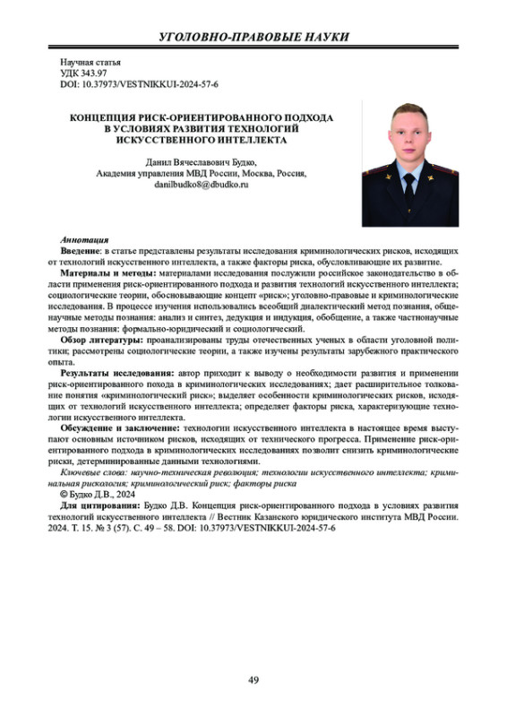 Материалы и методы: материалами исследования послужили российское законодательство в области применения риск-ориентированного подхода и развития технологий искусственного интеллекта; социологические теории, обосновывающие концепт «риск»; уголовно-правовые и криминологические исследования. В процессе изучения использовались всеобщий диалектический метод познания, общенаучные методы познания: анализ и синтез, дедукция и индукция, обобщение, а также частнонаучные методы познания: формально-юридический и социологический.
