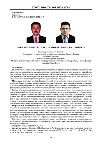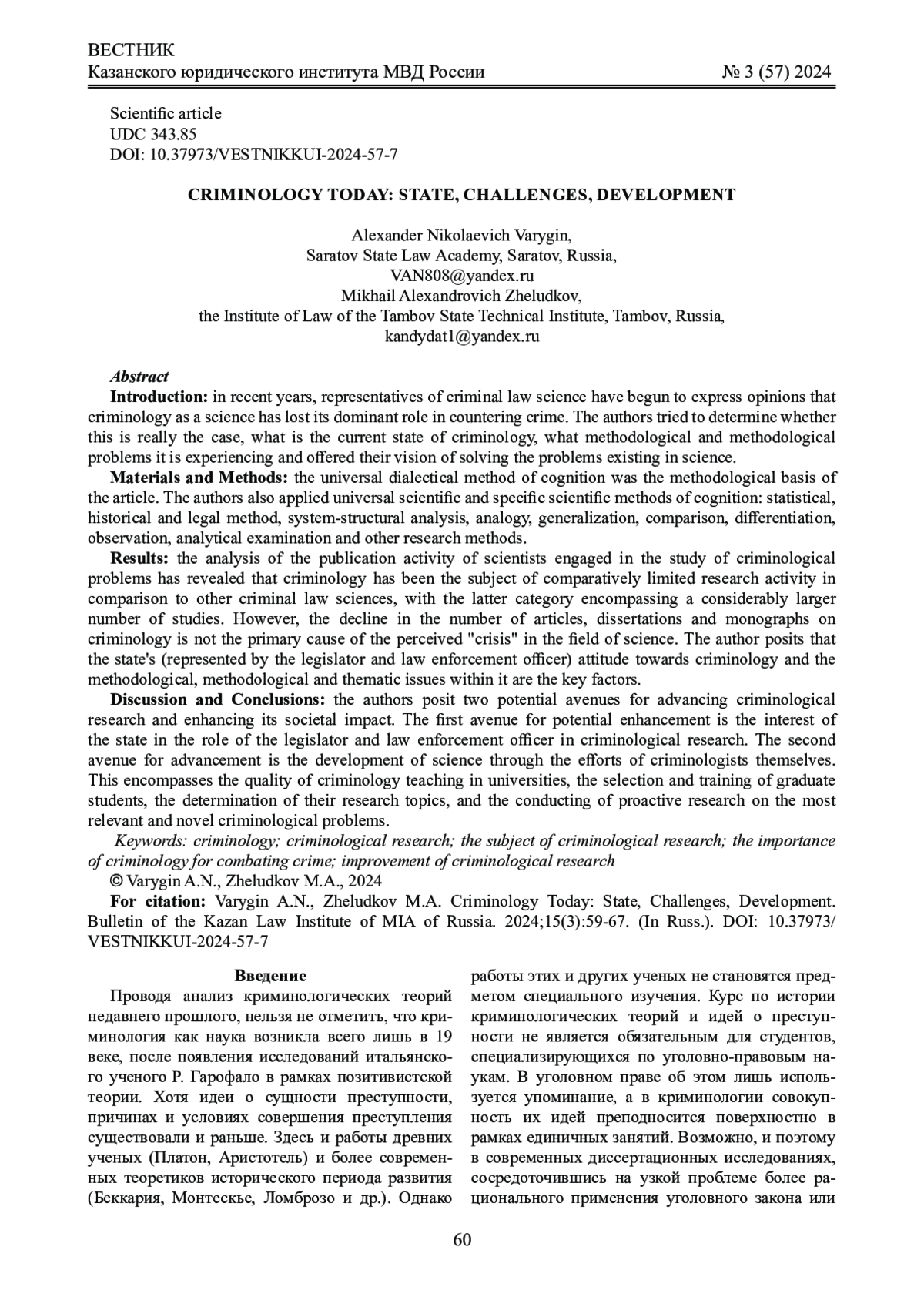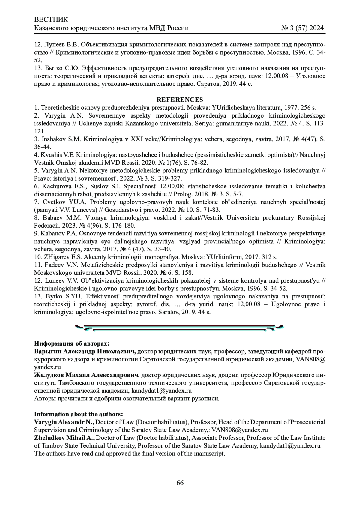 5. 	Варыгин А.Н. Некоторые методологические проблемы прикладного криминологического исследования // Право: история и современность. 2022. № 3. С. 319-327. EDN: DZEBPC