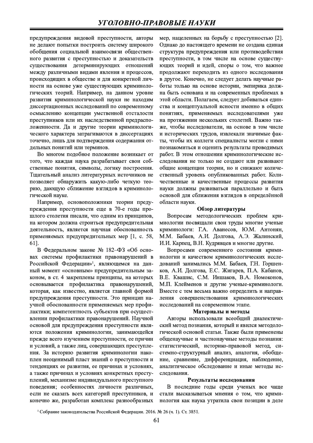 Обсуждение и заключение: в статье сформулирована позиция в отношении оценки российской, зарубежной криминолого-виктимологической профилактики, ресоциализации, роли в профилактике преступности правовых механизмов прогнозирования, программирования, применения инновационных технологий, искусственного интеллекта.