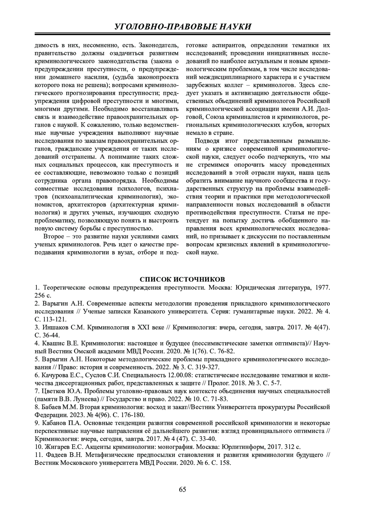11. 	Фадеев В.Н. Метафизические предпосылки становления и развития криминологии будущего // Вестник Московского университета МВД России. 2020. № 6. С. 158. EDN: ELJQQZ