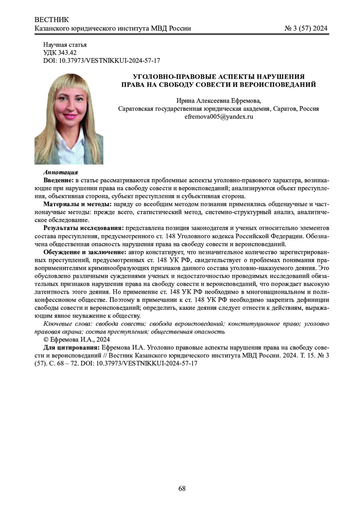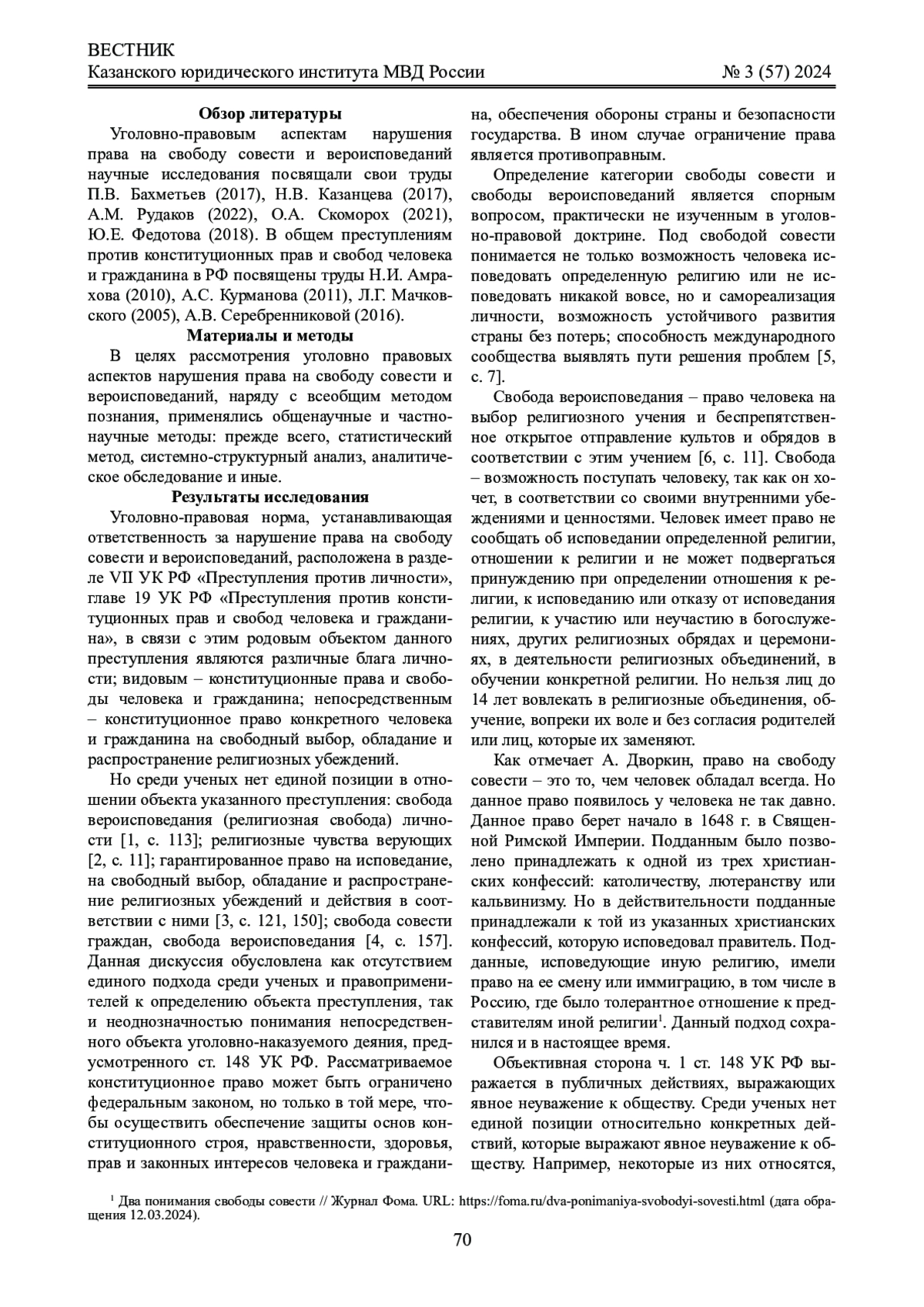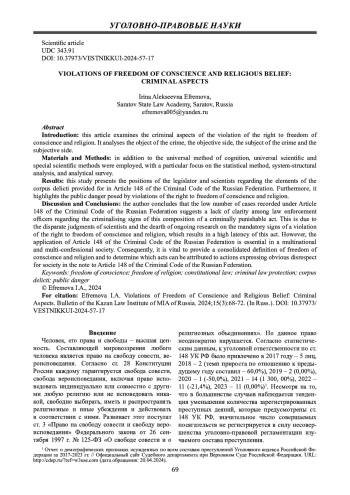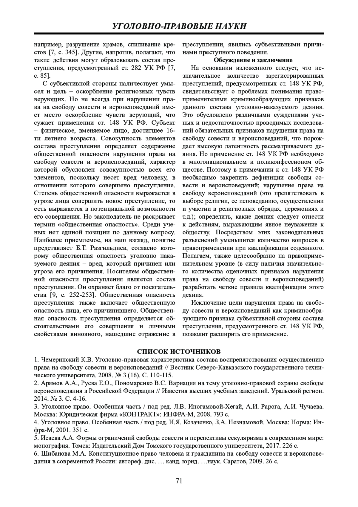 2. 	Арямов А.А., Руева Е.О., Пономаренко В.С. Вариация на тему уголовно-правовой охраны свободы вероисповедания в Российской Федерации // Известия высших учебных заведений. Уральский регион. 2014. № 3. С. 4-16. EDN: TETZJD