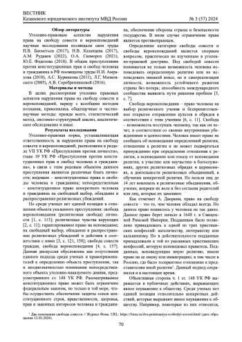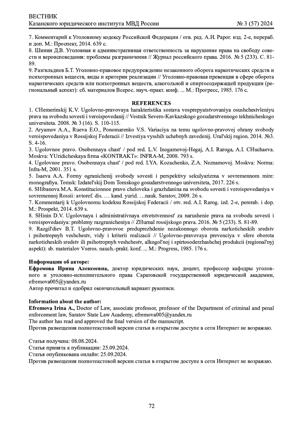 8. 	Шинин Д.В. Уголовная и административная ответственность за нарушение права на свободу совести и вероисповедания: проблемы разграничения // Журнал российского права. 2016. № 5 (233). С. 81-89.