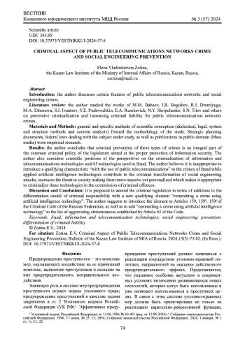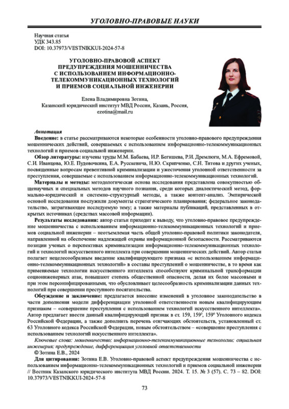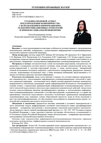 Введение: в статье рассматриваются некоторые особенности уголовно-правового предупреждения мошеннических действий, совершаемых с использованием информационно-телекоммуникационных технологий и приемов социальной инженерии.