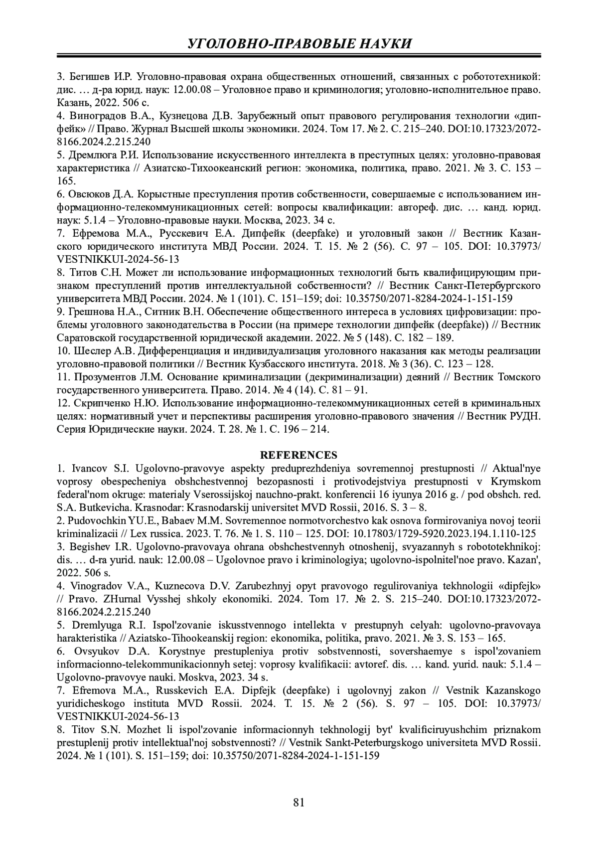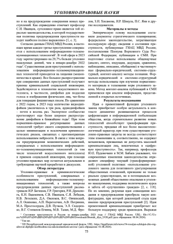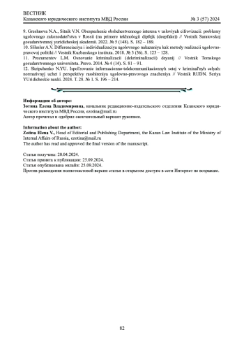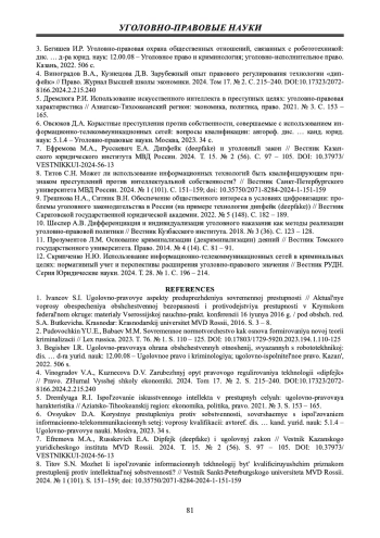 12. 	Скрипченко Н.Ю. Использование информационно-телекоммуникационных сетей в криминальных целях: нормативный учет и перспективы расширения уголовно-правового значения // Вестник РУДН. Серия Юридические науки. 2024. Т. 28. № 1. С. 196 - 214. EDN: QXGMAB