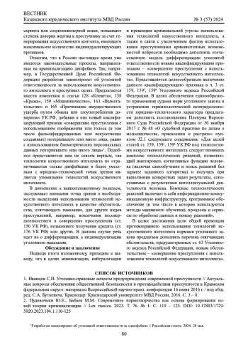 7. 	Ефремова М.А., Русскевич Е.А. Дипфейк (deepfake) и уголовный закон // Вестник Казанского юридического института МВД России. 2024. Т. 15. № 2 (56). С. 97 - 105. DOI: 10.37973/VESTNIKKUI-2024-56-13 EDN: LXAWLM