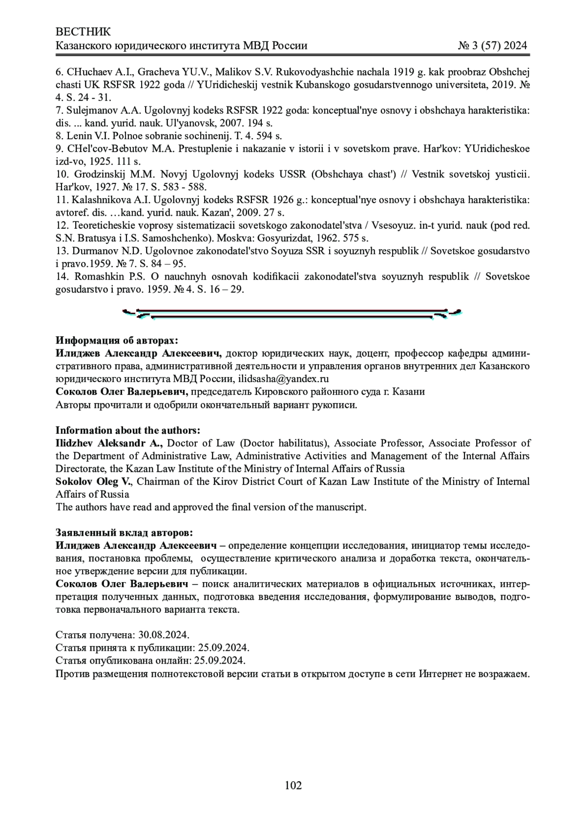 11. Калашникова А.И. Уголовный кодекс РСФСР 1926 г.: концептуальные основы и общая характеристика: автореф. дис. …канд. юрид. наук. Казань, 2009. 27 с. EDN: WZMBUA