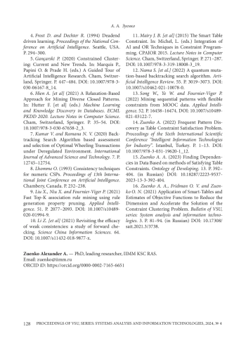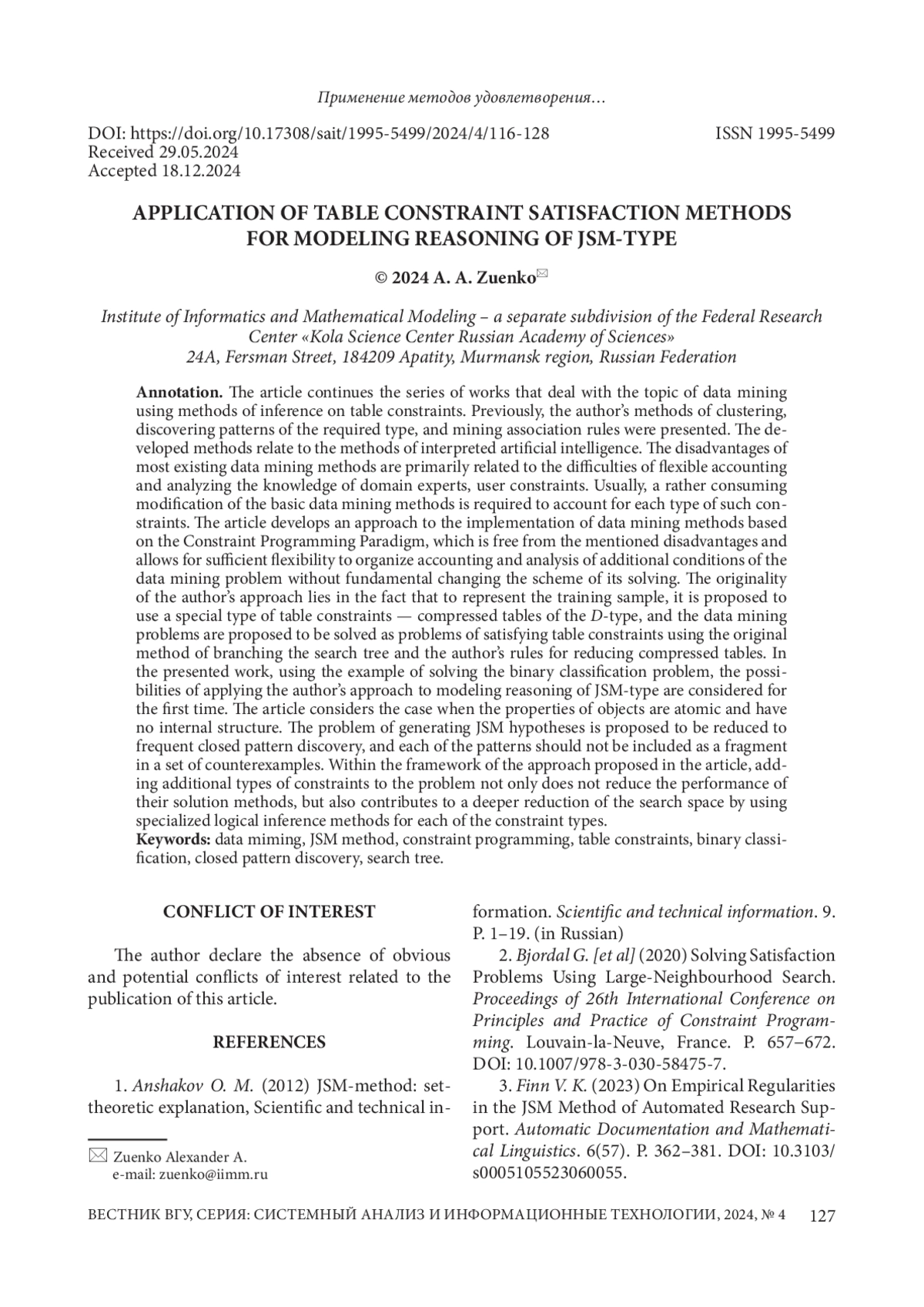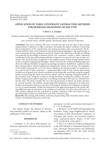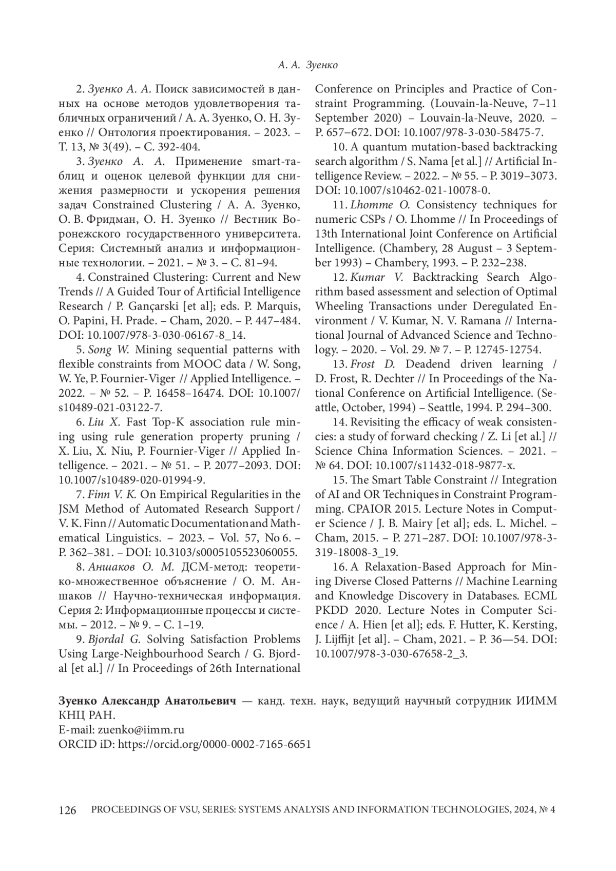 2. 	Зуенко А. А. Поиск зависимостей в данных на основе методов удовлетворения табличных ограничений / А. А. Зуенко, О. Н. Зуенко // Онтология проектирования. - 2023. - Т. 13, № 3(49). - С. 392-404. EDN: CLEEBH