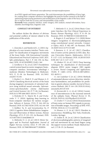 19. 	Geng X. [et al.] An improved feature extraction algorithms of EEG signals based on motor imagery brain-computer interface // Alexandria Engineering Journal. - 2022. - Vol. 61, No 6. - P. 4807-4820. DOI: 10.1016/j.aej.2021.10.034 EDN: RFYWXL