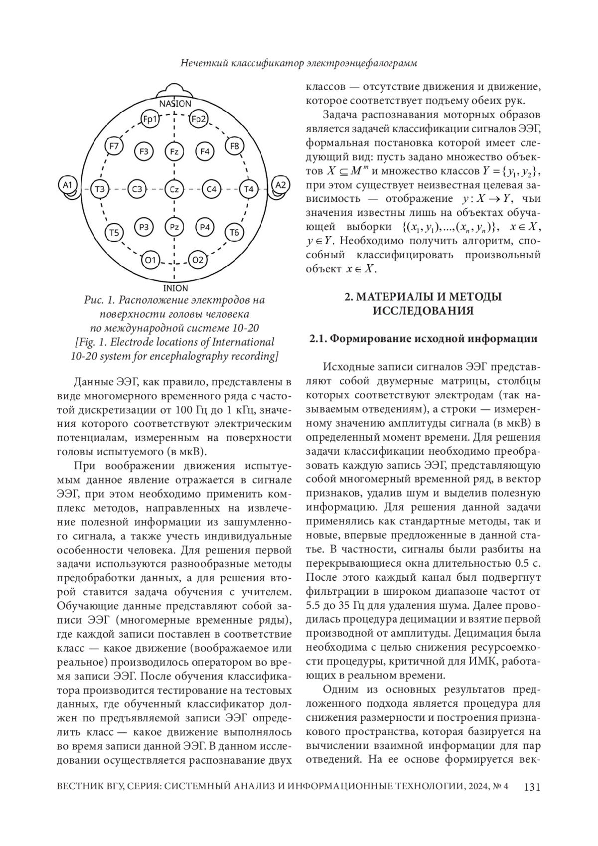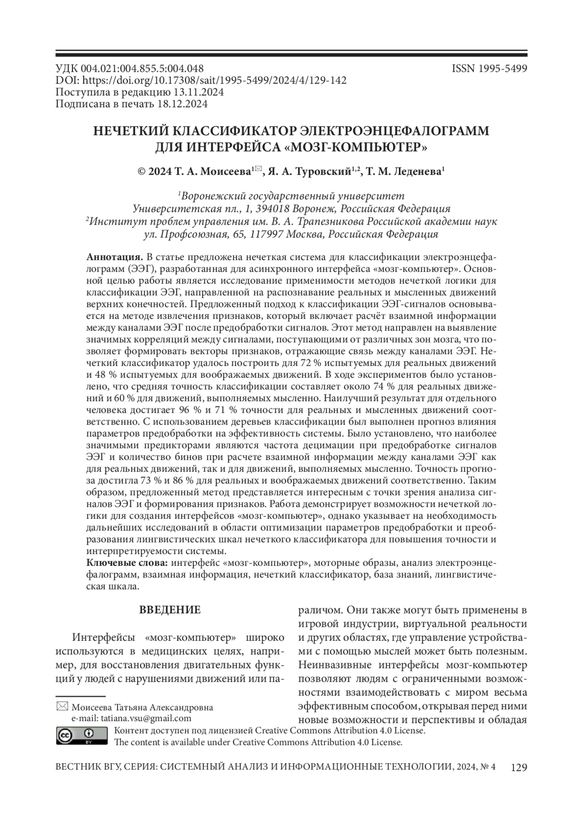 В статье предложена нечеткая система для классификации электроэнцефалограмм (ЭЭГ), разработанная для асинхронного интерфейса «мозг-компьютер». Основной целью работы является исследование применимости методов нечеткой логики для классификации ЭЭГ, направленной на распознавание реальных и мысленных движений верхних конечностей. Предложенный подход к классификации ЭЭГ-сигналов основывается на методе извлечения признаков, который включает расчёт взаимной информации между каналами ЭЭГ после предобработки сигналов. Этот метод направлен на выявление значимых корреляций между сигналами, поступающими от различных зон мозга, что позволяет формировать векторы признаков, отражающие связь между каналами ЭЭГ. Нечеткий классификатор удалось построить для 72 % испытуемых для реальных движений и 48 % испытуемых для воображаемых движений. В ходе экспериментов было установлено, что средняя точность классификации составляет около 74 % для реальных движений и 60 % для движений, выполняемых мысленно. Наилучший результат для отдельного человека достигает 96 % и 71 % точности для реальных и мысленных движений соответственно. С использованием деревьев классификации был выполнен прогноз влияния параметров предобработки на эффективность системы. Было установлено, что наиболее значимыми предикторами являются частота децимации при предобработке сигналов ЭЭГ и количество бинов при расчете взаимной информации между каналами ЭЭГ как для реальных движений, так и для движений, выполняемых мысленно. Точность прогноза достигла 73 % и 86 % для реальных и воображаемых движений соответственно. Таким образом, предложенный метод представляется интересным с точки зрения анализа сигналов ЭЭГ и формирования признаков. Работа демонстрирует возможности нечеткой логики для создания интерфейсов «мозг-компьютер», однако указывает на необходимость дальнейших исследований в области оптимизации параметров предобработки и преобразования лингвистических шкал нечеткого классификатора для повышения точности и интерпретируемости системы.