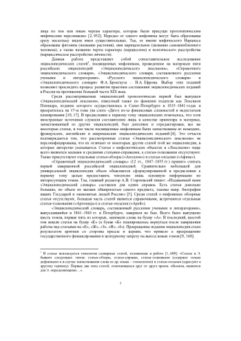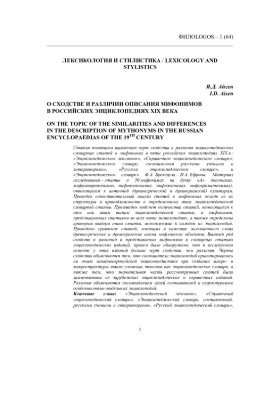 Статья посвящена выявлению черт сходства и различия энциклопедических словарных статей о мифонимах в пяти российских энциклопедиях XIX в.: «Энциклопедическом лексиконе», «Справочном энциклопедическом словаре», «Энциклопедическом словаре, составленном русскими учеными и литераторами», «Русском энциклопедическом словаре», и «Энциклопедическом словаре» Ф. А. Брокгауза - И. А. Ефрона. Материал исследования - статьи о 50 мифонимах на букву «А» (теонимах, мифоантропонимах, мифотопонимах, мифозоонимах, мифохрематонимах), относящихся к античной (древнегреческой и древнеримской) культурам. Проведен сопоставительный анализ статей о мифонимах исходя из их структуры и принадлежности к определенному типу энциклопедической словарной статьи. Произведен подсчет количества статей, относящихся к тем или иным типам энциклопедической статьи, и мифонимов, представленных статьями во всех пяти энциклопедиях, а также определены критерии выбора типа статьи, используемые в каждой из энциклопедий. Проведено сравнение статей, имеющих в качестве заголовочного слова древнегреческие и древнеримские имена мифических объектов. Выявлен ряд сходств и различий в представлении мифонимов в словарных статьях энциклопедических изданий, причем было обнаружено, что в исследуемом аспекте у этих изданий больше черт сходства, чем различия. Черты сходства объясняются тем, что составители энциклопедий ориентировались на опыт западноевропейской энциклопедистики при создании макро- и микроструктуры таких сложных текстов как энциклопедические словари, а также тем, что значительная часть рассмотренных статей была заимствована из зарубежных энциклопедических и справочных изданий. Различия объясняются несовпадением целей составителей и структурными особенностями отдельных энциклопедий.