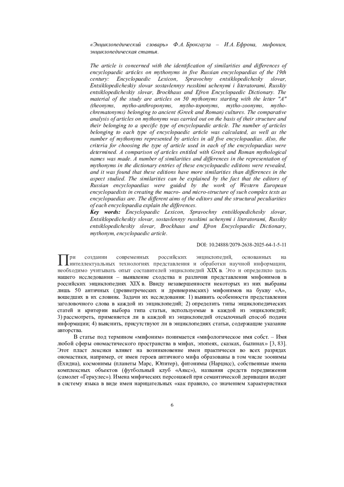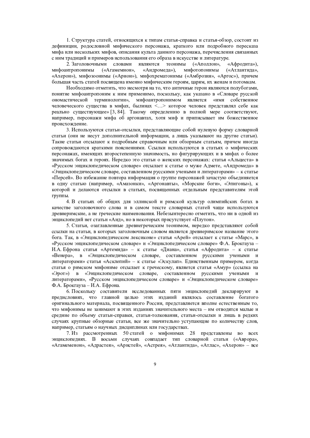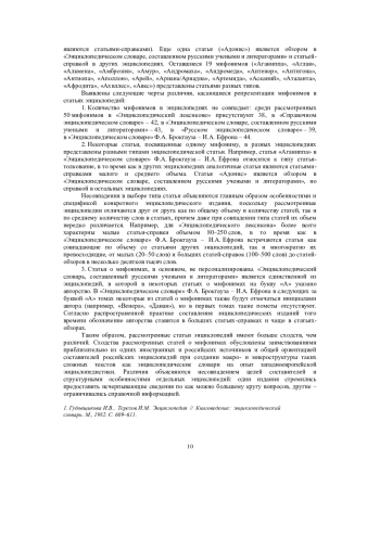 При создании современных российских энциклопедий, основанных на интеллектуальных технологиях представления и обработки научной информации, необходимо учитывать опыт составителей энциклопедий XIX в. Это и определило цель нашего исследования – выявление сходства и различия представления мифонимов в российских энциклопедиях XIX в. Ввиду незавершенности некоторых из них выбраны лишь 50 античных (древнегреческих и древнеримских) мифонимов на букву «А», вошедших в их словник. Задачи их исследования: 1) выявить особенности представления заголовочного слова в каждой из энциклопедий; 2) определить типы энциклопедических статей и критерии выбора типа статьи, используемые в каждой из энциклопедий; 3) рассмотреть, применяется ли в каждой из энциклопедий отсылочный способ подачи информации; 4) выяснить, присутствуют ли в энциклопедиях статьи, содержащие указание авторства.