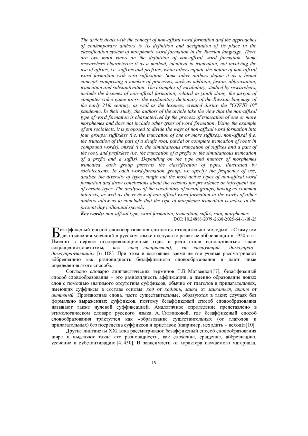 В статье рассматривается понятие безаффиксного словообразования и подходы современных авторов к его определению и обозначению места в системе классификации морфемных способов словообразования в русском языке. Выделяются два основных взгляда на определение безаффиксного способа словообразования. Одни исследователи характеризуют его как способ, тождественный усечению, при котором не используются аффиксы - суффиксы и приставки, а некоторые из них приравнивают понятие безаффиксного словообразования к нулевой суффиксации. Другие авторы определяют его как широкое понятие, объединяющее ряд процессов, таких как сложение, сращение, аббревиация, усечение и субстантивация. В качестве примеров лексики, изучаемой исследователями, приводятся лексемы безаффиксного способа словообразования молодежного сленга, жаргона пользователей компьютерных видеоигр, толкового словаря русского языка начала XXI века, а также лексемы, созданные в период пандемии «Ковид-19». Автор статьи в своем исследовании придерживаются мнения о том, что безаффиксный способ словообразования характеризуется процессом усечения одной или нескольких морфем и не включает в себя другие виды словообразования. На примере материала десяти социолектов предлагается разделение способов безаффиксного словообразования на четыре группы: бессуффиксальные (усечение одного или нескольких суффиксов), безаффиксные (усечение части единственного корня, частичное или полное усечение корней сложных слов), смешанные (одновременное усечение суффиксов и части корня) и бесприставочные (усечение приставки или одновременное усечение приставки и суффикса). В зависимости от типа и количества усекаемых морфем в каждой группе приводится классификация видов, иллюстрируемых социолектизмами. В каждой словообразовательной группе приводится частотность использования, анализируется видовое разнообразие, выделяются наиболее активные виды безаффиксного словообразования, делаются выводы о причинах преобладания или редкого использования видов. Анализ лексики социальных групп, не связанных общими интересами, а также рассмотрение места безаффиксного способа словообразования в работах других авторов, позволяет сделать вывод об активности способа усечения морфем в современной разговорной речи.