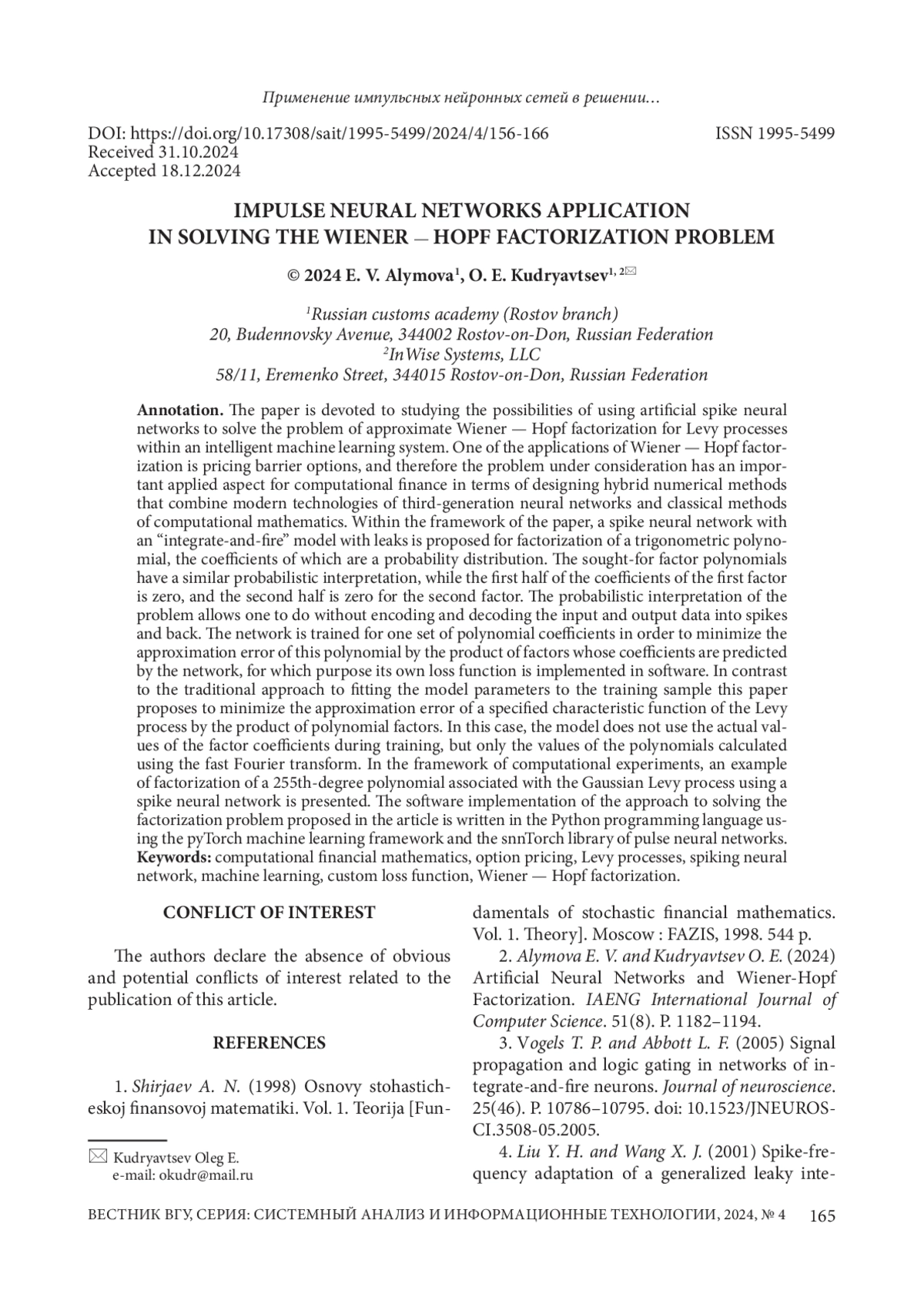 Работа посвящена изучению возможностей применения искусственных импульсных (или спайковых) нейронных сетей для решения задачи приближенной факторизации Винера - Хопфа для процессов Леви в рамках интеллектуальной системы машинного обучения. Одним из приложений факторизации Винера - Хопфа является вычисление цен барьерных опционов, в связи с чем рассматриваемая задача имеет важный прикладной аспект для вычислительной финансовой математики в части создания гибридных численных методов, комбинирующих современные технологии нейросетей третьего поколения и классические методы вычислительной математики. В рамках статьи предложена импульсная нейронная сеть с моделью «интегрировать-и-сработать» с утечками для факторизации тригонометрического полинома в комплексной форме, коэффициенты которого представляют собой распределение вероятностей. Искомые многочлены-факторы имеют аналогичную вероятностную интерпретацию, при этом у первого фактора первая половина коэффициентов равна нулю, а у второго - вторая половина. Вероятностная интерпретация задачи позволяет обойтись без кодирования и декодирования входных и выходных данных в спайки и обратно. Обучение сети проводится для одного набора коэффициентов полинома с целью минимизировать ошибку приближения этого полинома произведением факторов, коэффициенты которых предсказываются сетью, для чего программно реализована собственная функция потерь. В отличие от традиционного подхода к подбору параметров модели на обучающей выборке, в данной работе предлагается минимизировать ошибку приближения конкретной характеристической функции процесса Леви произведением многочленов-факторов. При этом модель не использует фактические значения коэффициентов факторов при обучении, а только значения многочленов, вычисленные с помощью быстрого преобразования Фурье. В рамках вычислительных экспериментов представлен пример факторизации полинома 255-й степени, связанного с гауссовым процессом Леви, с помощью спайковой нейросети. Программная реализация предлагаемого в статье подхода к решению задачи факторизации написана на языке программирования Python с использованием фреймворка машинного обучения pyTorch и библиотеки snnTorch импульсных нейронных сетей.
