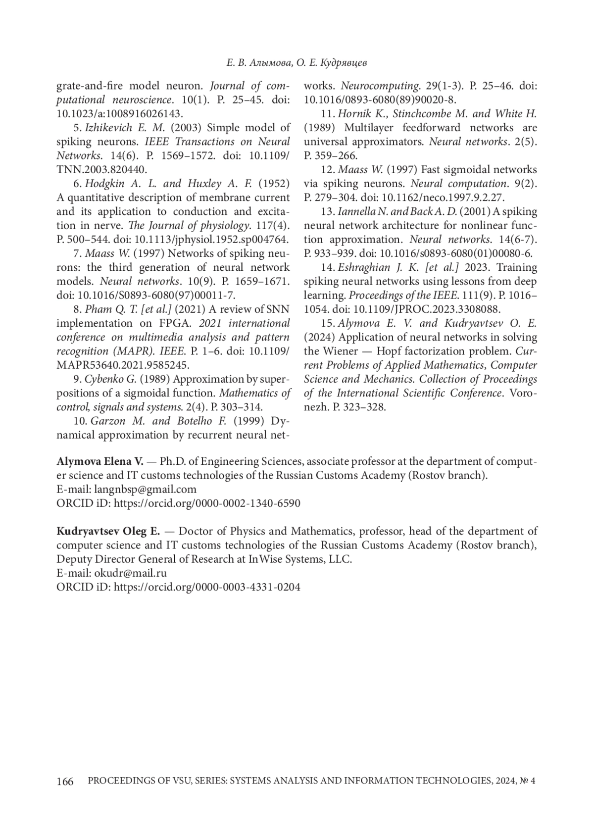 12. Maass W. Fast sigmoidal networks via spiking neurons // Neural computation. - 1997. - Vol. 9, Iss. 2. - P. 279-304. 10.1162/ neco.1997.9.2.27. DOI: 10.1162/neco.1997.9.2.27