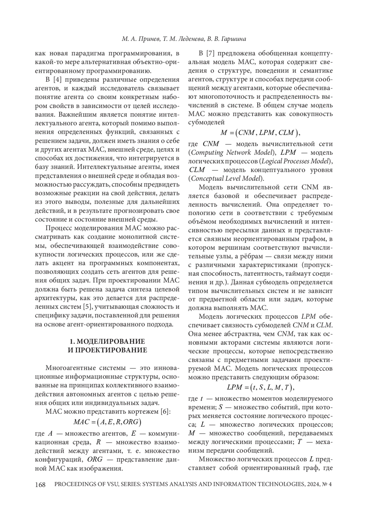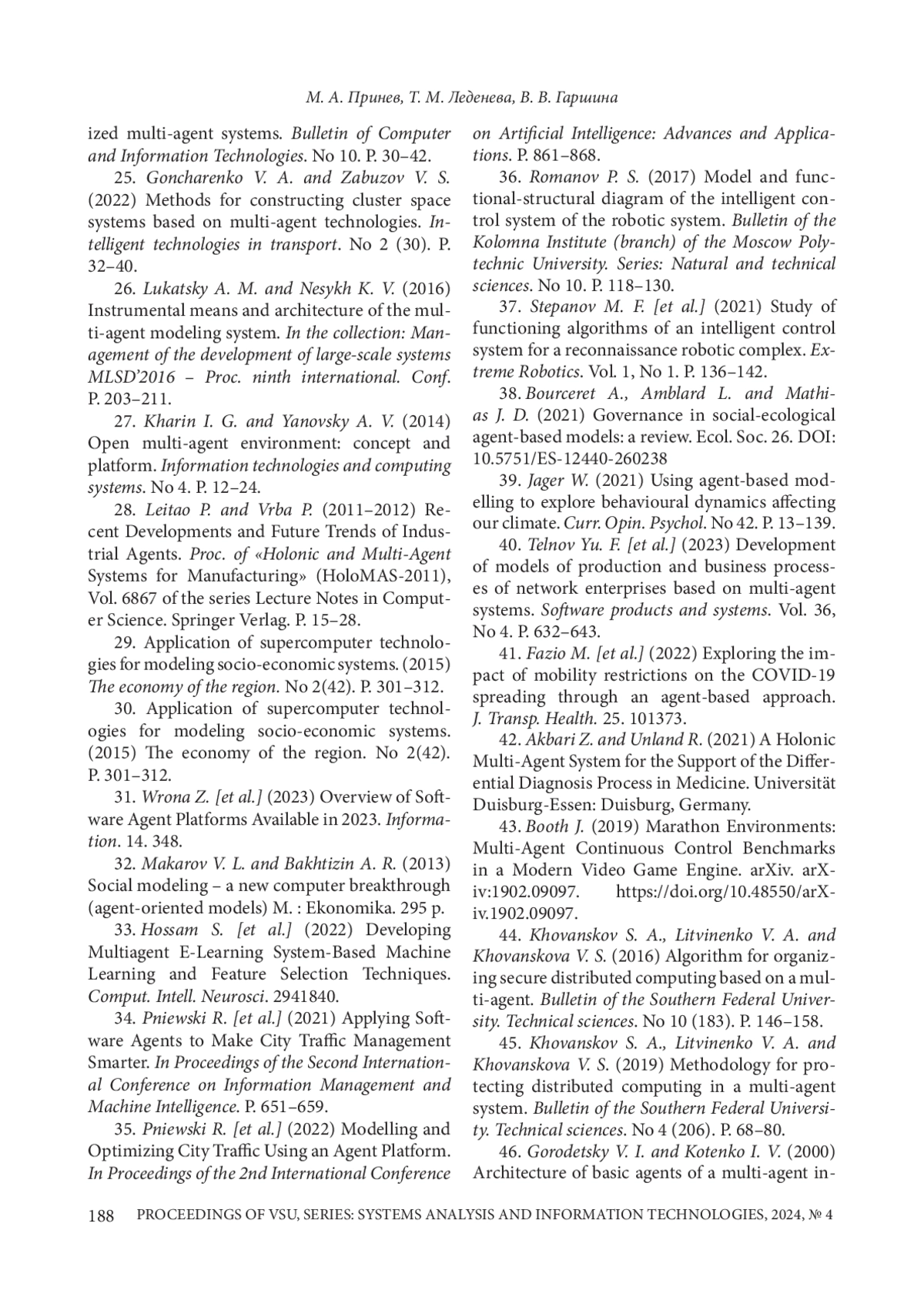 4. 	Леденева Т. М. Многоагентные системы: модели агентов и постановки задач, обеспечивающие их характерные свойства (часть 1) / Т. М. Леденева, М. А. Принев // Вестник Воронежского государственного университетата. Серия: Системный анализ и информационные технологии. - 2024. - № 3. - С. 50-73. DOI: 10.17308/sait/19955499/2024/3/50-73