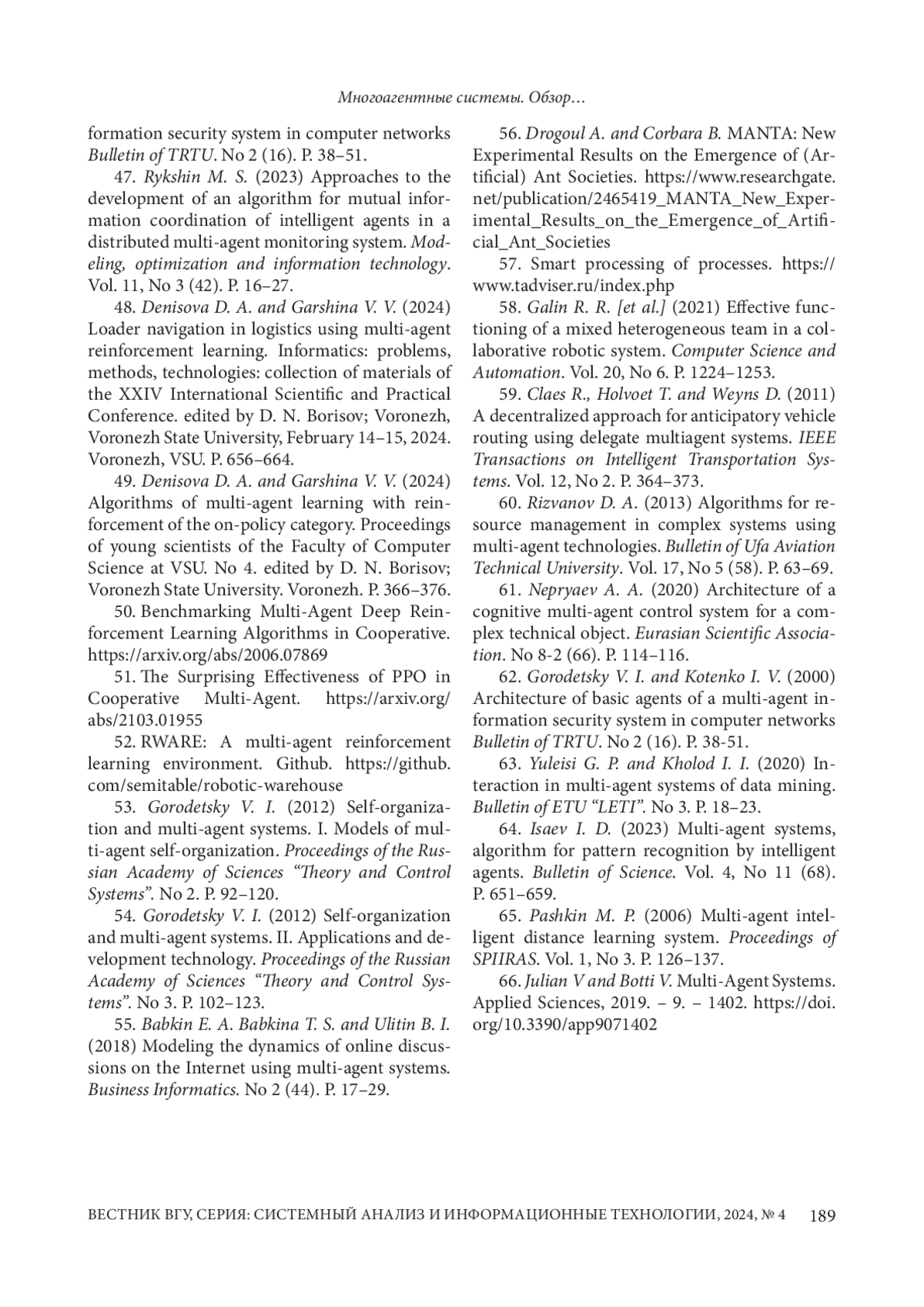 66. 	Julian V, Botti V. Multi-Agent Systems. Applied Sciences, 2019. - 9. - 1402. Режим доступа: 10.3390/app9071402 (дата обращения 20.10 2023). DOI: 10.3390/app9071402(