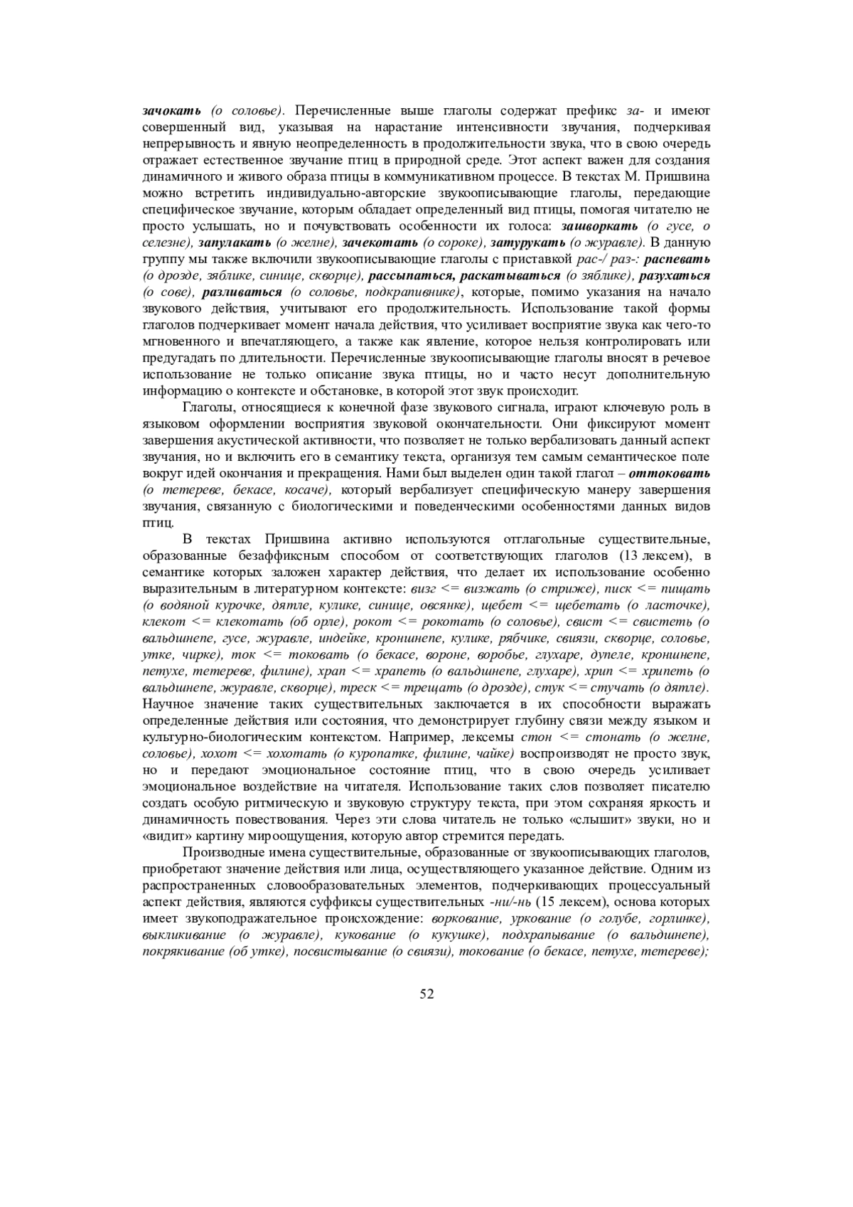 Статья посвящена изучению словообразовательных возможностей звукоописательных глаголов в произведениях М. Пришвина, что позволяет глубже понять механизмы формирования звуковых образов в художественном тексте. Авторы проводят детальный анализ звукоописательных глаголов и отглагольных существительных, которые играют ключевую роль в создании выразительной и эмоциональной атмосферы его произведений. Основное внимание уделяется деривационным процессам, обуславливающим создание новых слов. Выявляются продуктивные аффиксы, модели словообразования и способы формирования словообразовательных цепочек, что позволяет классифицировать глаголы по временным характеристикам звуковых сигналов птиц. Выделяются пять категорий глаголов: описывающие короткие, продолжительные, прерывистые звуковые сигналы, начальную и конечную фазы звучания. Для каждой категории приводятся примеры лексем, детализирующие их морфологические особенности, функциональное значение и влияние на стилистическое оформление текста. Важной частью исследования становится анализ отглагольных существительных, которые усиливают выразительность текста, сохраняя ключевые семантические характеристики исходных глаголов. Особое внимание уделяется индивидуально-авторским приемам М. Пришвина, который активно использует глаголы и существительные в непривычных значениях для описания звуков, издаваемых птицами. Кроме того, исследуются механизмы полисемии звукоописательных глаголов, их способность адаптироваться к различным контекстам и отражать эмоциональное состояние птиц. Анализ не только показывает, что звукоописательные глаголы в произведениях М. Пришвина обладают высокой степенью семантической гибкости, позволяя им адаптироваться в различных ситуациях и стилистически обогащать тексты, но и подтверждает значимость лексико-словообразовательного анализа для изучения механизмов формирования художественных образов в текстах М. Пришвина, а также подчеркивает роль звуковой палитры в создании определенной атмосферы его произведений. Звукоподражательные лексемы становятся мощным инструментом художественной выразительности, которые позволяют М. Пришвину превращать звук в средство создания различных образов, способных не только оживлять текст, но и формировать уникальный лексико-семантический код, отражающий глубинную связь языка и природы.