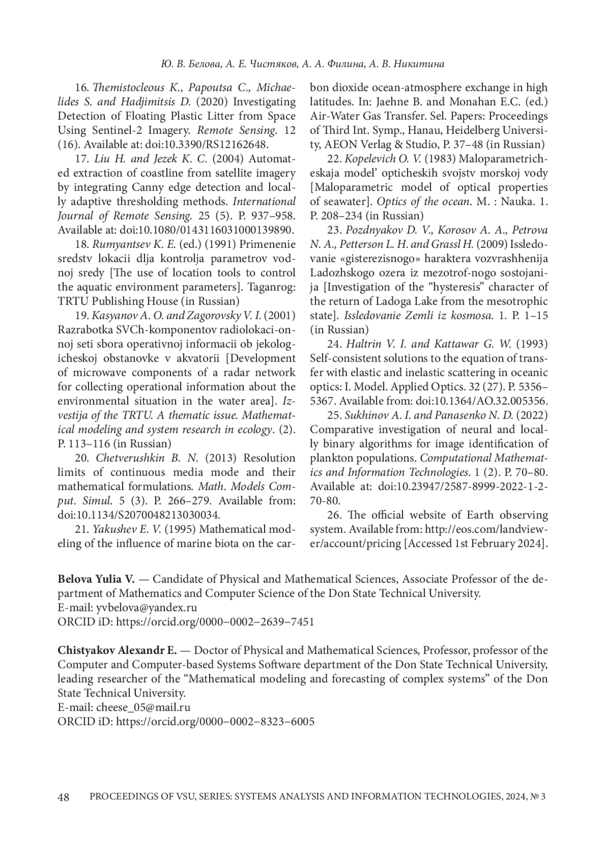 25. Sukhinov A. I.Comparative investigation of neural and locally binary algorithms for image identification of plankton populations / A. I. Sukhinov, N. D. Panasenko // Computational Mathematics and Information Technologies. -2022. - Т. 1, № 2. - С. 70-80. DOI: 10.23947/2587-8999-2022-1-2-70-80 EDN: RVJQPK