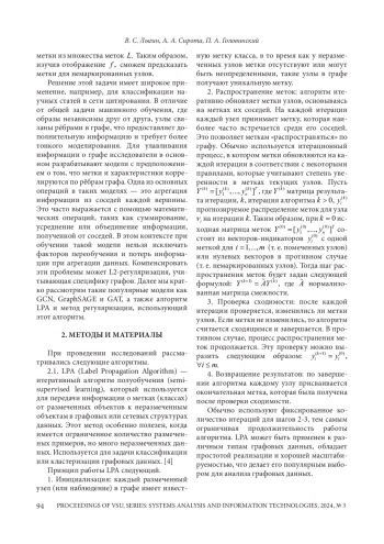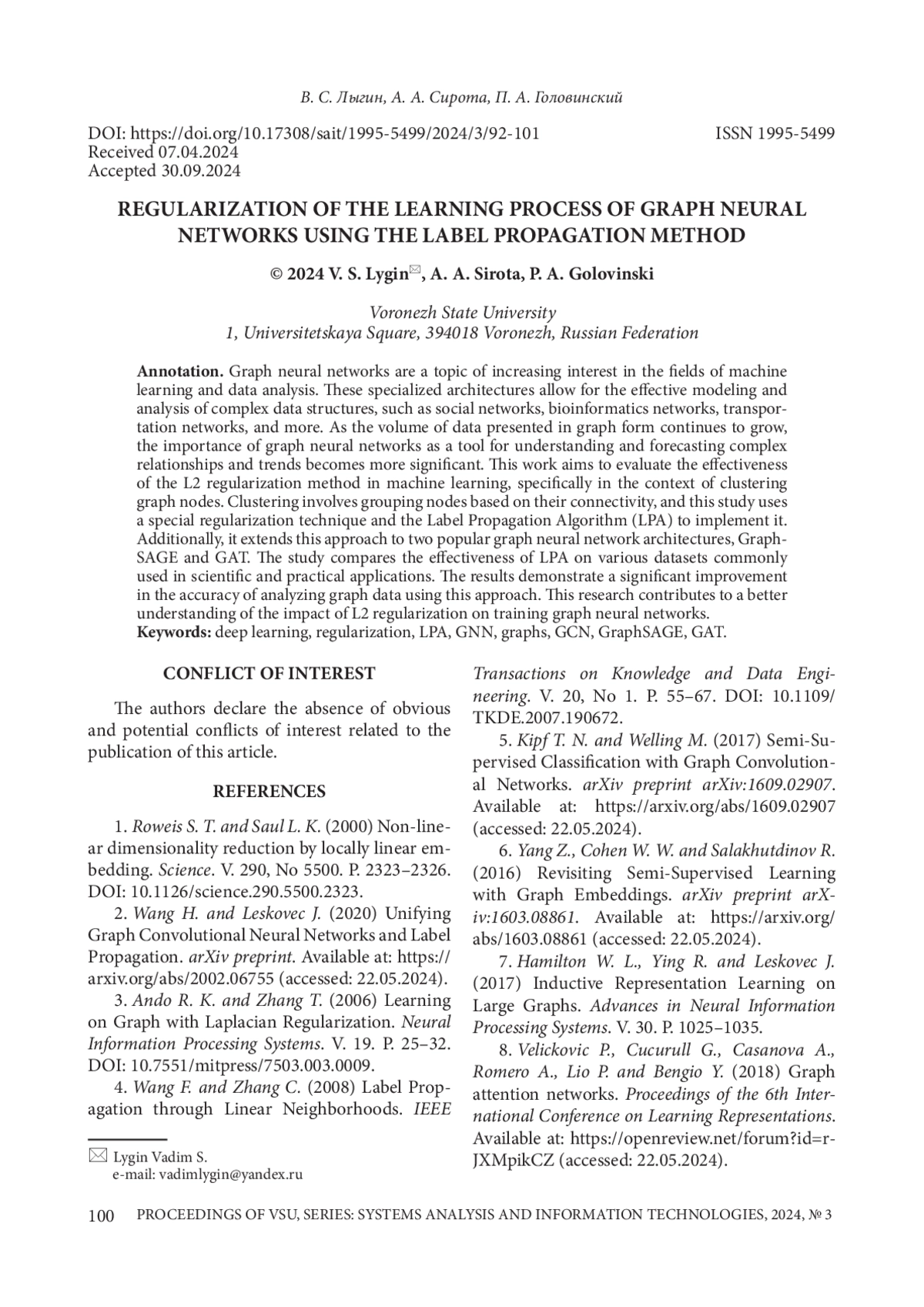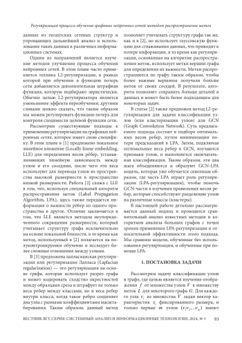 Графовые нейронные сети в настоящее время являются объектом все возрастающего интереса в области машинного обучения и анализа данных. Их специализированная архитектура позволяет эффективно моделировать и анализировать сложные структуры данных на графах, такие как социальные сети, биоинформационные сети, транспортные сети и другие. С возрастанием объема данных, представленных в виде графов, растет их значимость как инструмента для понимания и прогнозирования сложных взаимосвязей и паттернов. Данная работа направлена на оценку эффективности метода L2-регуляризации, применяемого при машинном обучении в контексте задачи кластеризации узлов графа. Под кластеризацией понимается объединение узлов в группы, выделяемые по степени их связности. При обучении используется специальный метод регуляризации и реализующий его алгоритм распространения меток LPA (Label Propagation Algorithm), а также расширение данного подхода на две популярные архитектуры графовых нейронных сетей: GraphSAGE (Graph Sample and Aggregation) и GAT (Graph Attention Networks). В рамках исследования проводится сравнительный анализ эффективности применения метода LPA на различных датасетах, широко применяемых в научных и практических задачах. Результаты исследования показывают заметное улучшение точности анализа графовых моделей данных при использовании анализируемого подхода. Проведенное исследование способствует более глубокому пониманию воздействия общего подхода L2-регуляризации в плане обучения графовых нейронных сетей.