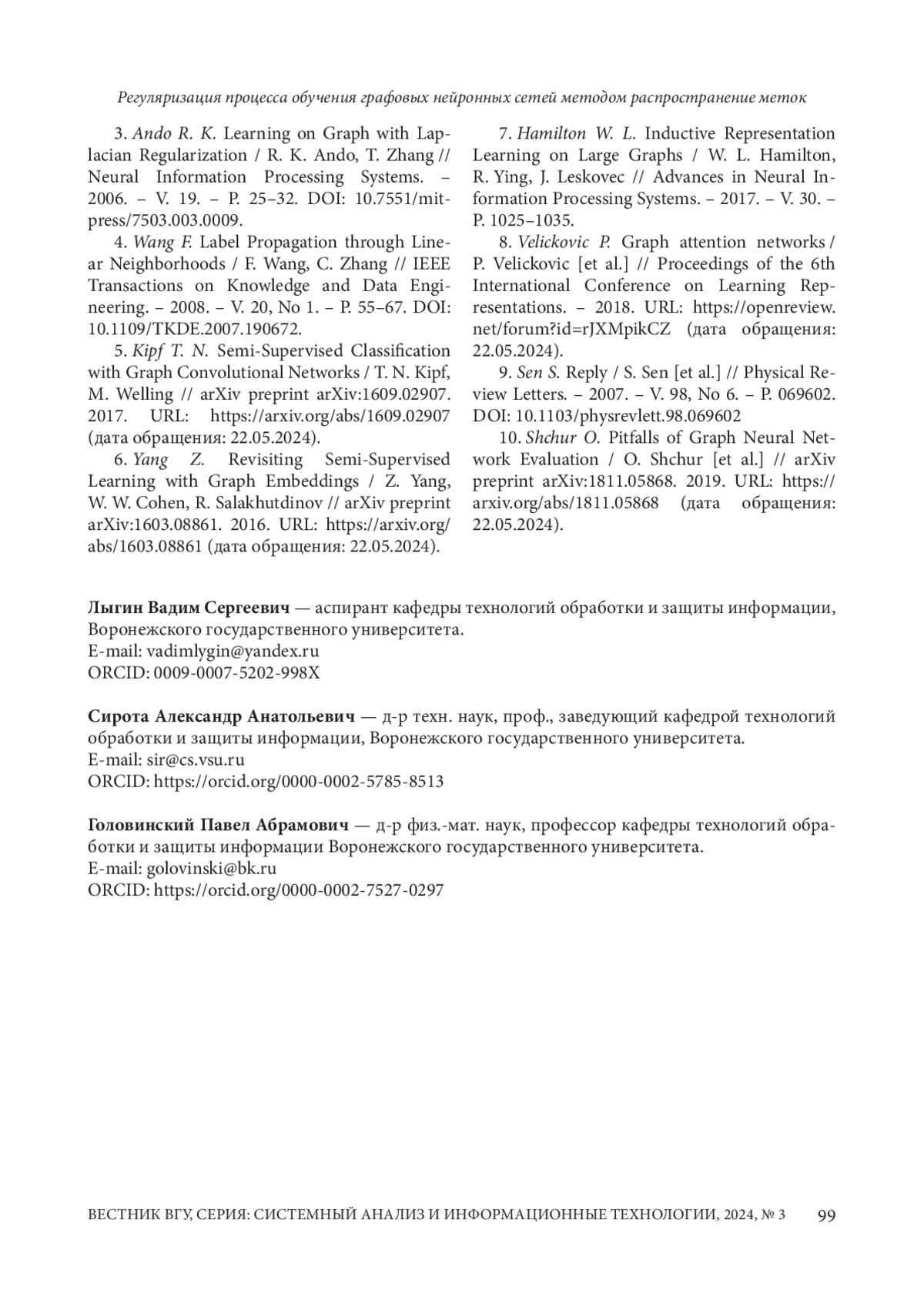 5. 	Kipf T. N. Semi-Supervised Classification with Graph Convolutional Networks / T. N. Kipf, M. Welling // arXiv preprint arXiv: 1609.02907. 2017. URL: https://arxiv.org/abs/1609.02907 (дата обращения: 22.05.2024).