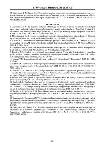 1. Антонович Е. К. Использование цифровых технологий при допросе свидетелей на досудебных стадиях уголовного судопроизводства (сравнительно-правовой анализ законодательства Российской Федерации и законодательства некоторых иностранных государств) // Актуальные проблемы российского права. 2019. № 6. С. 125-136. DOI: 10.17803/1994-1471.2019.103.6.125-136 EDN: EUEMRP