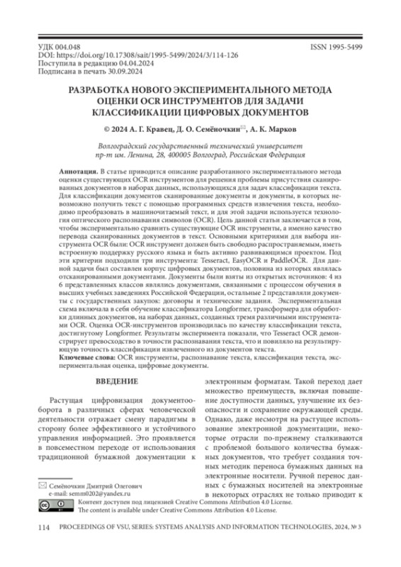 В статье приводится описание разработанного экспериментального метода оценки существующих OCR инструментов для решения проблемы присутствия сканированных документов в наборах данных, использующихся для задач классификации текста. Для классификации документов сканированные документы и документы, в которых невозможно получить текст с помощью программных средств извлечения текста, необходимо преобразовать в машиночитаемый текст, и для этой задачи используется технология оптического распознавания символов (OCR). Цель данной статьи заключается в том, чтобы экспериментально сравнить существующие OCR инструменты, а именно качество перевода сканированных документов в текст. Основными критериями для выбора инструмента OCR были: OCR инструмент должен быть свободно распространяемым, иметь встроенную поддержку русского языка и быть активно развивающимся проектом. Под эти критерии подходили три инструмента: Tesseract, EasyOCR и PaddleOCR. Для данной задачи был составлен корпус цифровых документов, половина из которых являлась отсканированными документами. Документы были взяты из открытых источников: 4 из 6 представленных классов являлись документами, связанными с процессом обучения в высших учебных заведениях Российской Федерации, остальные 2 представляли документы с государственных закупок: договоры и технические задания. Экспериментальная схема включала в себя обучение классификатора Longformer, трансформера для обработки длинных документов, на наборах данных, созданных тремя различными инструментами OCR. Оценка OCR-инструментов производилась по качеству классификации текста, достигнутому Longformer. Результаты эксперимента показали, что Tesseract OCR демонстрирует превосходство в точности распознавания текста, что и повиляло на результирующую точность классификации извлеченного из документов текста.