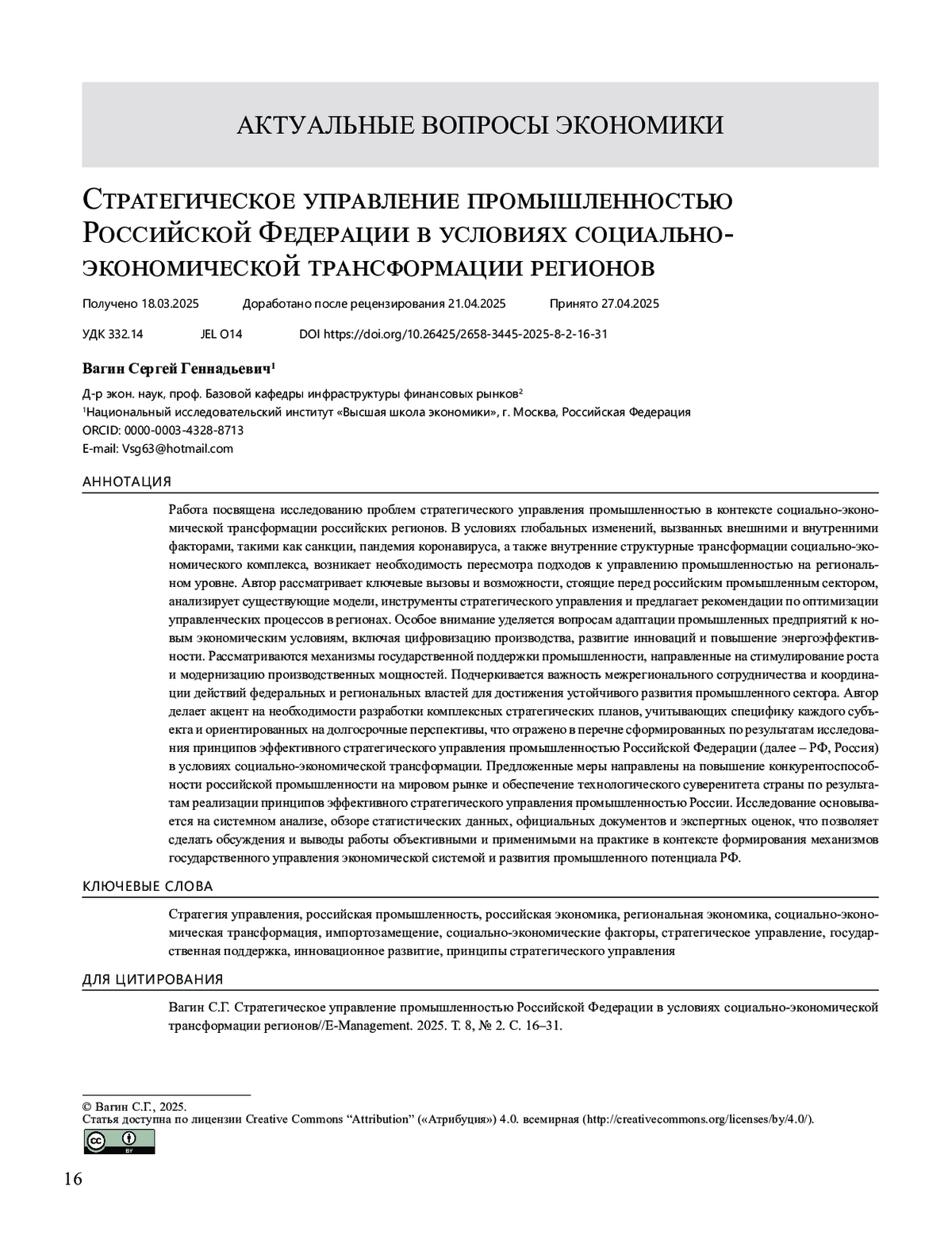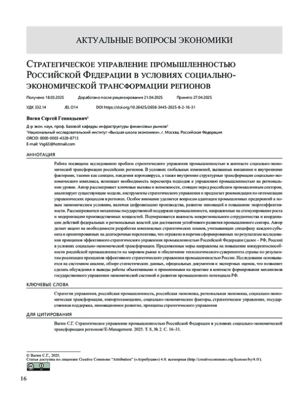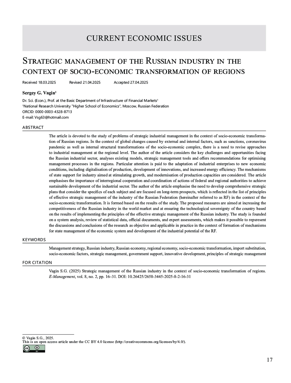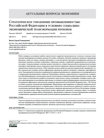 Работа посвящена исследованию проблем стратегического управления промышленностью в контексте социально-экономической трансформации российских регионов. В условиях глобальных изменений, вызванных внешними и внутренними факторами, такими как санкции, пандемия коронавируса, а также внутренние структурные трансформации социально-экономического комплекса, возникает необходимость пересмотра подходов к управлению промышленностью на региональном уровне. Автор рассматриваeт ключевые вызовы и возможности, стоящие перед российским промышленным сектором, анализирует существующие модели, инструменты стратегического управления и предлагает рекомендации по оптимизации управленческих процессов в регионах. Особое внимание уделяется вопросам адаптации промышленных предприятий к новым экономическим условиям, включая цифровизацию производства, развитие инноваций и повышение энергоэффективности. Рассматриваются механизмы государственной поддержки промышленности, направленные на стимулирование роста и модернизацию производственных мощностей. Подчеркивается важность межрегионального сотрудничества и координации действий федеральных и региональных властей для достижения устойчивого развития промышленного сектора. Автор делает акцент на необходимости разработки комплексных стратегических планов, учитывающих специфику каждого субъекта и ориентированных на долгосрочные перспективы, что отражено в перечне сформированных по результатам исследования принципов эффективного стратегического управления промышленностью Российской Федерации (далее – РФ, Россия) в условиях социально-экономической трансформации. Предложенные меры направлены на повышение конкурентоспособности российской промышленности на мировом рынке и обеспечение технологического суверенитета страны по результатам реализации принципов эффективного стратегического управления промышленностью России. Исследование основывается на системном анализе, обзоре статистических данных, официальных документов и экспертных оценок, что позволяет сделать обсуждения и выводы работы объективными и применимыми на практике в контексте формирования механизмов государственного управления экономической системой и развития промышленного потенциала РФ.