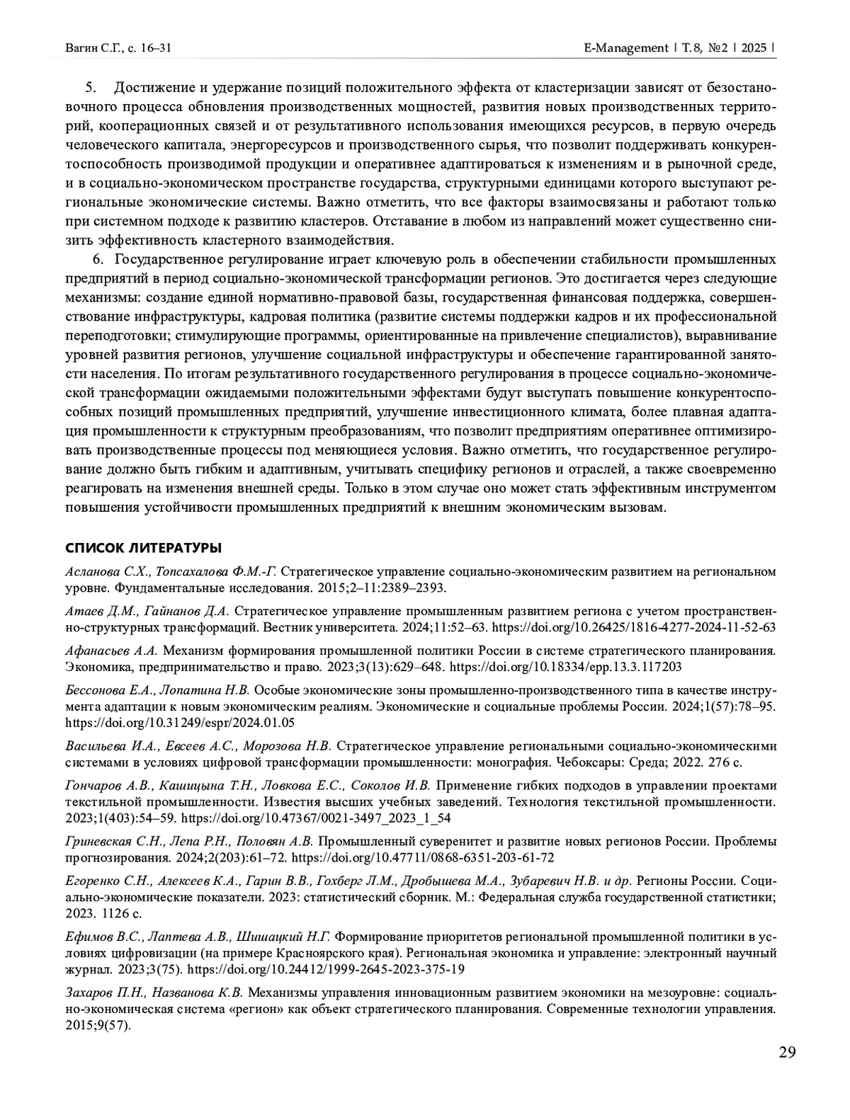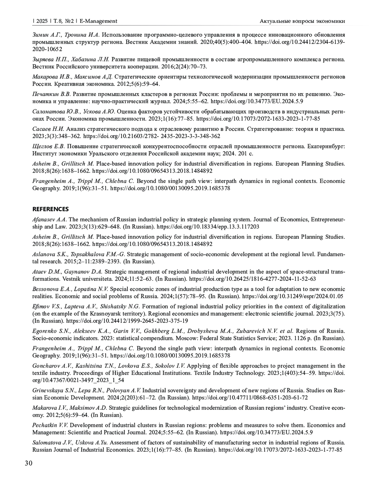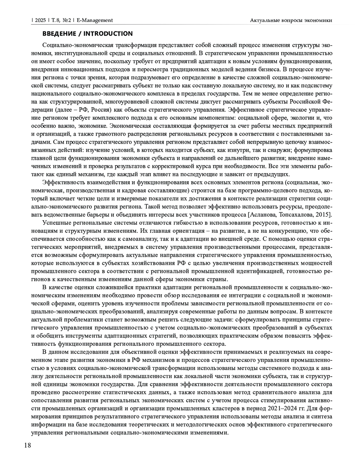 Работа посвящена исследованию проблем стратегического управления промышленностью в контексте социально-экономической трансформации российских регионов. В условиях глобальных изменений, вызванных внешними и внутренними факторами, такими как санкции, пандемия коронавируса, а также внутренние структурные трансформации социально-экономического комплекса, возникает необходимость пересмотра подходов к управлению промышленностью на региональном уровне. Автор рассматриваeт ключевые вызовы и возможности, стоящие перед российским промышленным сектором, анализирует существующие модели, инструменты стратегического управления и предлагает рекомендации по оптимизации управленческих процессов в регионах. Особое внимание уделяется вопросам адаптации промышленных предприятий к новым экономическим условиям, включая цифровизацию производства, развитие инноваций и повышение энергоэффективности. Рассматриваются механизмы государственной поддержки промышленности, направленные на стимулирование роста и модернизацию производственных мощностей. Подчеркивается важность межрегионального сотрудничества и координации действий федеральных и региональных властей для достижения устойчивого развития промышленного сектора. Автор делает акцент на необходимости разработки комплексных стратегических планов, учитывающих специфику каждого субъекта и ориентированных на долгосрочные перспективы, что отражено в перечне сформированных по результатам исследования принципов эффективного стратегического управления промышленностью Российской Федерации (далее – РФ, Россия) в условиях социально-экономической трансформации. Предложенные меры направлены на повышение конкурентоспособности российской промышленности на мировом рынке и обеспечение технологического суверенитета страны по результатам реализации принципов эффективного стратегического управления промышленностью России. Исследование основывается на системном анализе, обзоре статистических данных, официальных документов и экспертных оценок, что позволяет сделать обсуждения и выводы работы объективными и применимыми на практике в контексте формирования механизмов государственного управления экономической системой и развития промышленного потенциала РФ.
