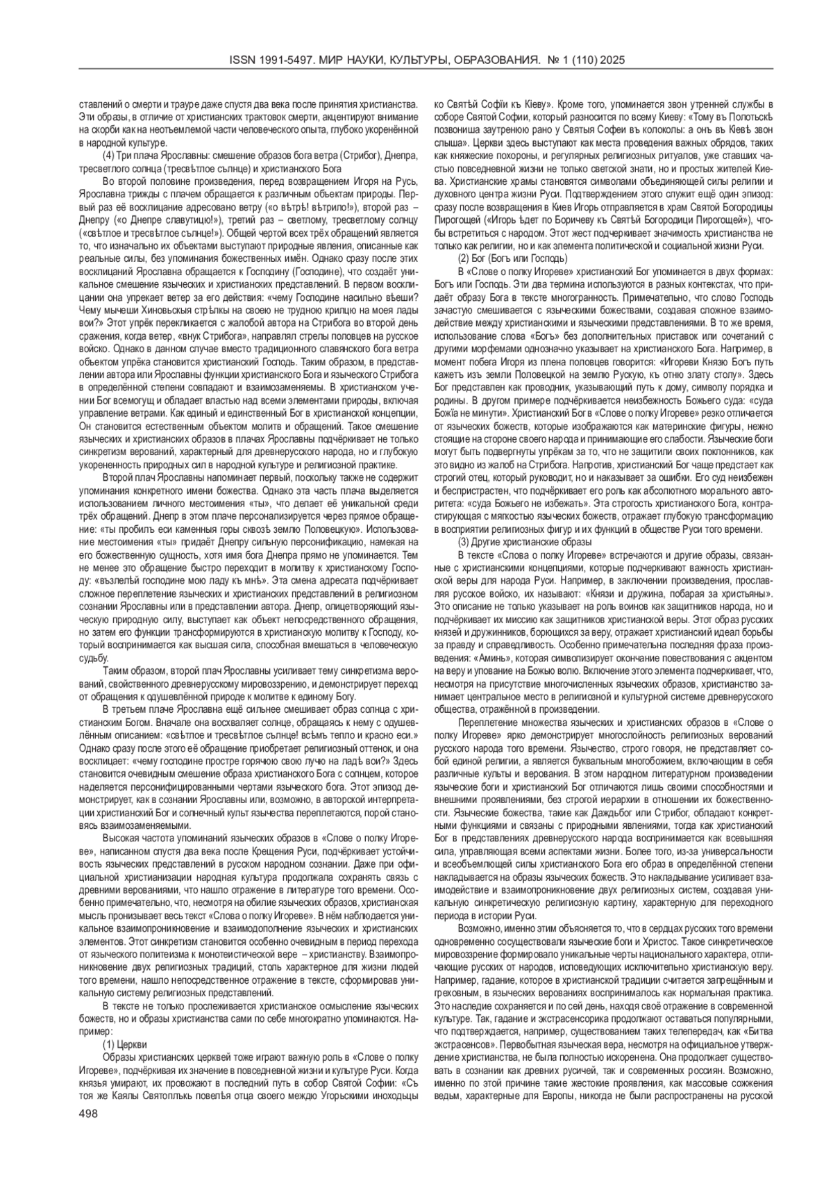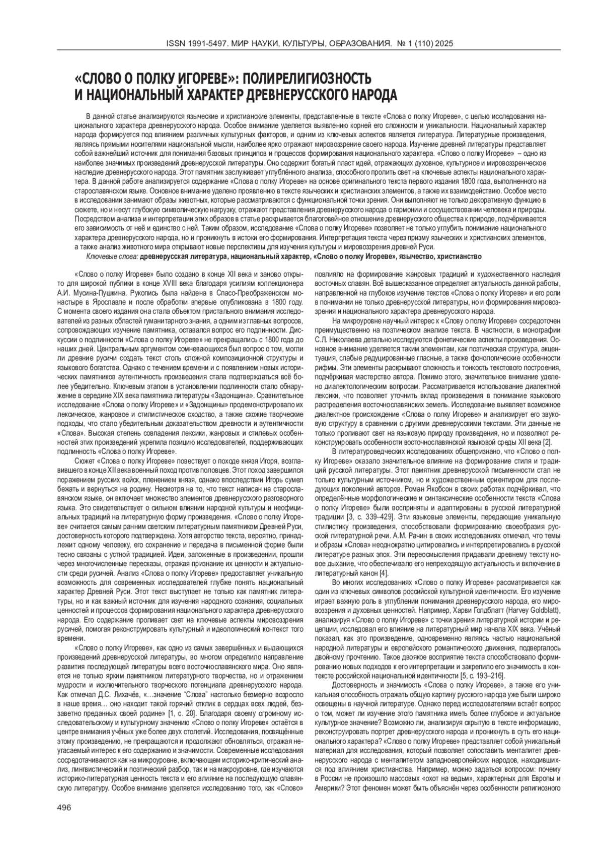 В данной статье анализируются языческие и христианские элементы, представленные в тексте «Слова о полку Игореве», с целью исследования национального характера древнерусского народа. Особое внимание уделяется выявлению корней его сложности и уникальности. Национальный характер народа формируется под влиянием различных культурных факторов, и одним из ключевых аспектов является литература. Литературные произведения, являясь прямыми носителями национальной мысли, наиболее ярко отражают мировоззрение своего народа. Изучение древней литературы представляет собой важнейший источник для понимания базовых принципов и процессов формирования национального характера. «Слово о полку Игореве» - одно из наиболее значимых произведений древнерусской литературы. Оно содержит богатый пласт идей, отражающих духовное, культурное и мировоззренческое наследие древнерусского народа. Этот памятник заслуживает углублённого анализа, способного пролить свет на ключевые аспекты национального характера. В данной работе анализируется содержание «Слова о полку Игореве» на основе оригинального текста первого издания 1800 года, выполненного на старославянском языке. Основное внимание уделено проявлению в тексте языческих и христианских элементов, а также их взаимодействию. Особое место в исследовании занимают образы животных, которые рассматриваются с функциональной точки зрения. Они выполняют не только декоративную функцию в сюжете, но и несут глубокую символическую нагрузку, отражают представления древнерусского народа о гармонии и сосуществовании человека и природы. Посредством анализа и интерпретации этих образов в статье раскрывается благоговейное отношение древнерусского общества к природе, подчёркивается его зависимость от неё и единство с ней. Таким образом, исследование «Слова о полку Игореве» позволяет не только углубить понимание национального характера древнерусского народа, но и проникнуть в истоки его формирования. Интерпретация текста через призму языческих и христианских элементов, а также анализ животного мира открывают новые перспективы для изучения культуры и мировоззрения древней Руси.