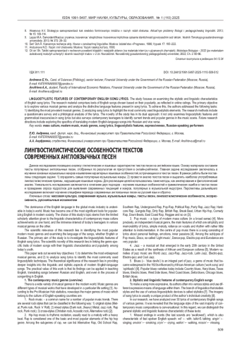 Данное исследование посвящено анализу стилистических и языковых характеристик текстов песен на английском языке. Основу материала составили тексты популярных англоязычных песен, отобранных по результатам их присутствия в онлайн-рейтингах. Главная задача исследования заключалась в изучении основных музыкальных жанров и выявлении характерных языковых особенностей, встречающихся в текстах песен. В рамках работы были постав лены следующие задачи: 1) определить самые популярные музыкальные жанры; 2) провести анализ текстов песен и выделить наиболее употребляемые лингвостилистические приемы, нарушающие языковые нормы. Для реализации целей использовались такие методы, как анкетирование и филологический анализ. Уникальность исследования заключается в сочетании двух подходов – изучение языковых особенностей и грамматических ошибок в текстах песен и проведение опроса подростков для выявления современных тенденций и жанров, популярных в музыкальной индустрии. Перспективы дальнейшего исследования включают изучение специфики перевода современных англоязычных песен на русский язык и обратно.