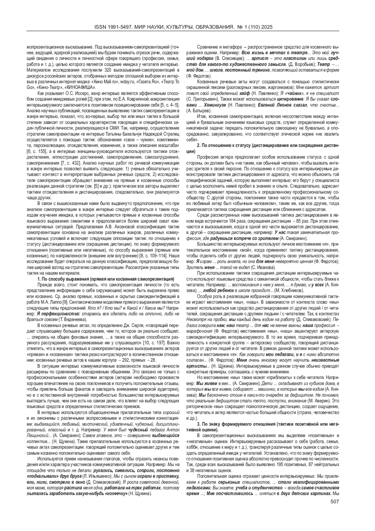 В статье развиваются идеи теории самопрезентации как коммуникативной стратегии управления впечатлением. В центре работы находится соотношение стратегии, присущих ей тактик и тех коммуникативных ходов (речевых приемов, языковых средств), в которых реализуются тактики. Особое внимание в исследовании уделяется самому выбору такого соотношения, методологического подхода, где предполагается заведомо более широкий охват коммуникативных ситуаций, реализующих стратегию самопрезентации. В статье вслед за концепцией А. В. Аксеновой выделяется несколько ключевых аспектов самопрезентации: дистанцирование и сокращение дистанции по отношению к реципиенту и другим людям; позитивная и негативная оценки, которые актеры применяют для передачи ценностного отношения к своей профессии, мировоззрения; внешняя и внутренняя направленность самопрезентации; прямая и косвенная самопрезентация. На материале 320 высказываний описываются ведущие тактики самопрезентации российских актеров в жанре интервью.