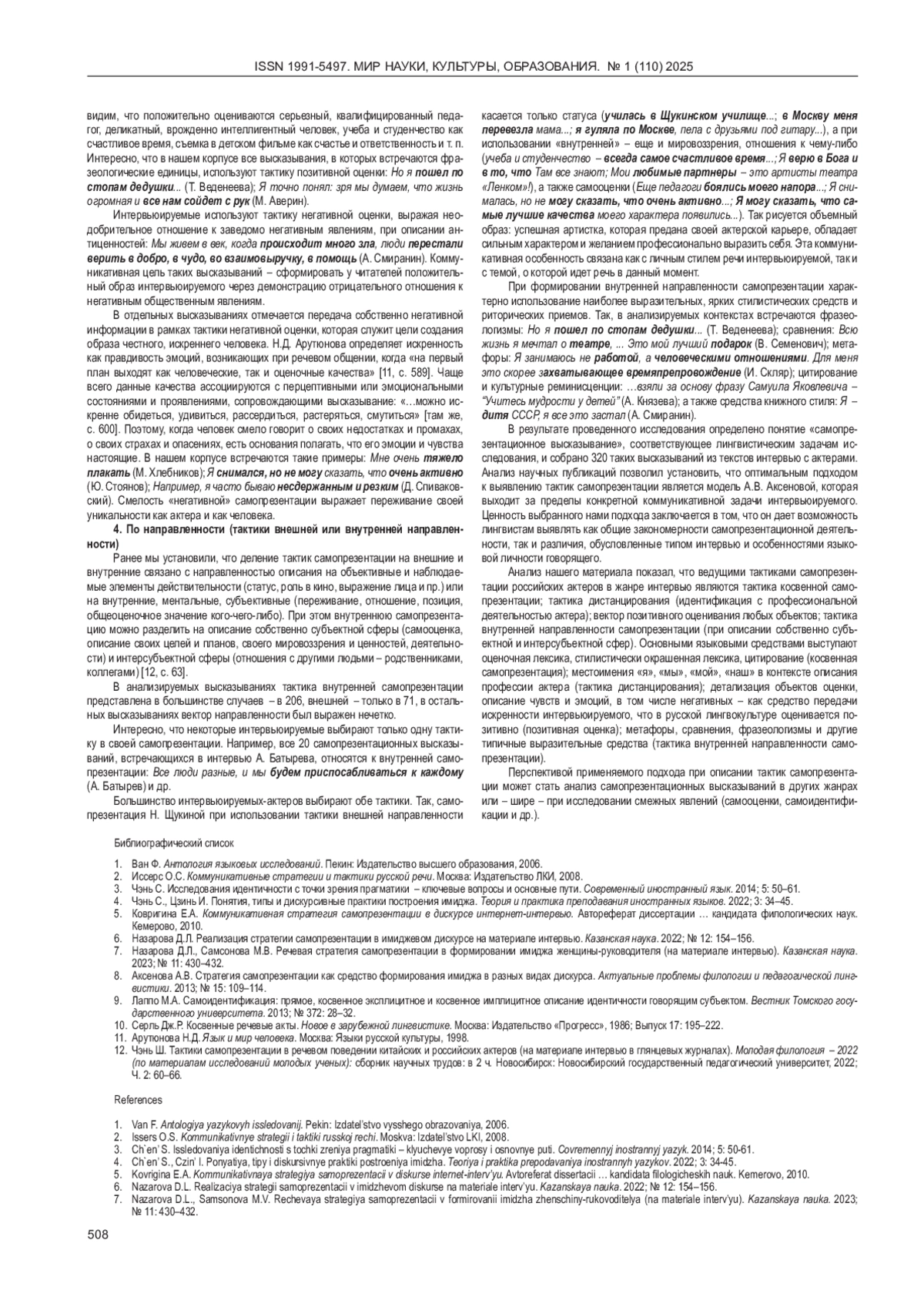 8. 	Аксенова А.В. Стратегия самопрезентации как средство формирования имиджа в разных видах дискурса. Актуальные проблемы филологии и педагогической лингвистики. 2013; № 15: 109-114. EDN: RJZWEH