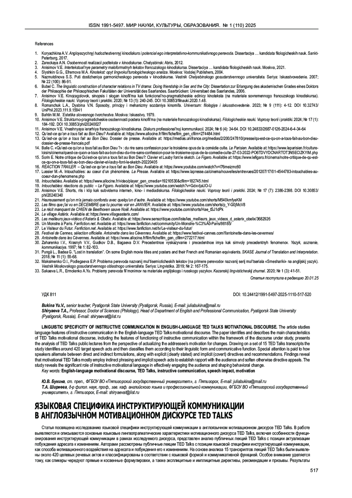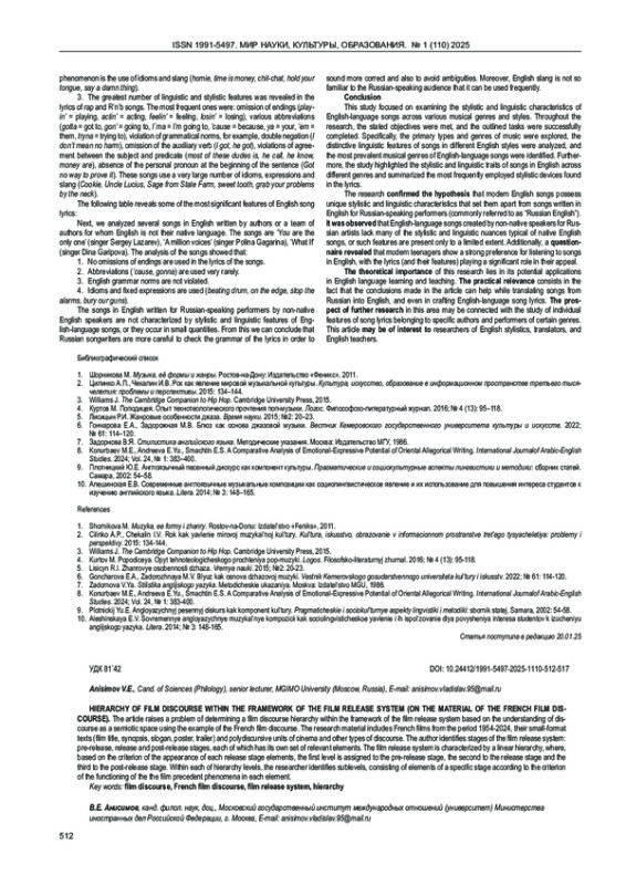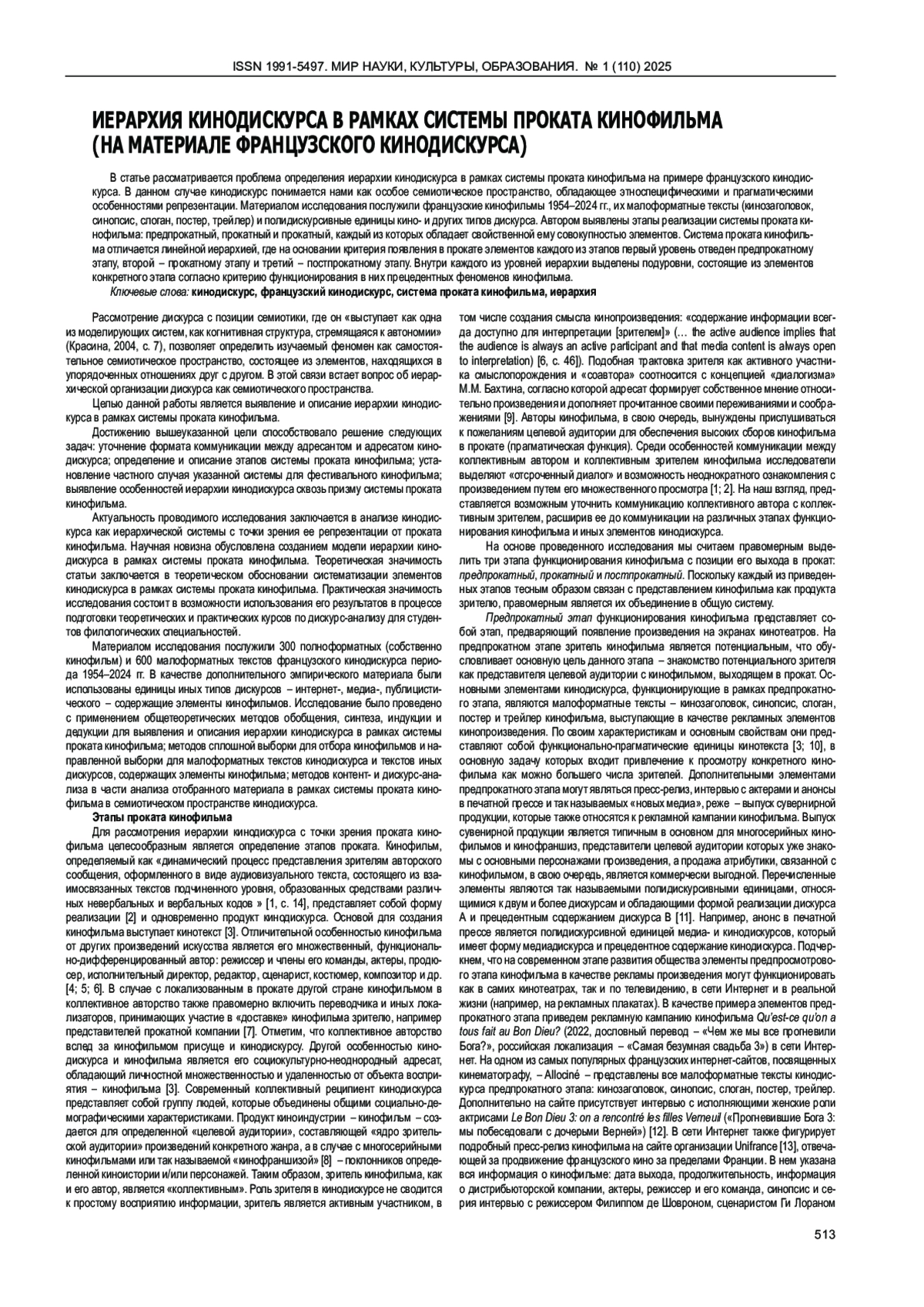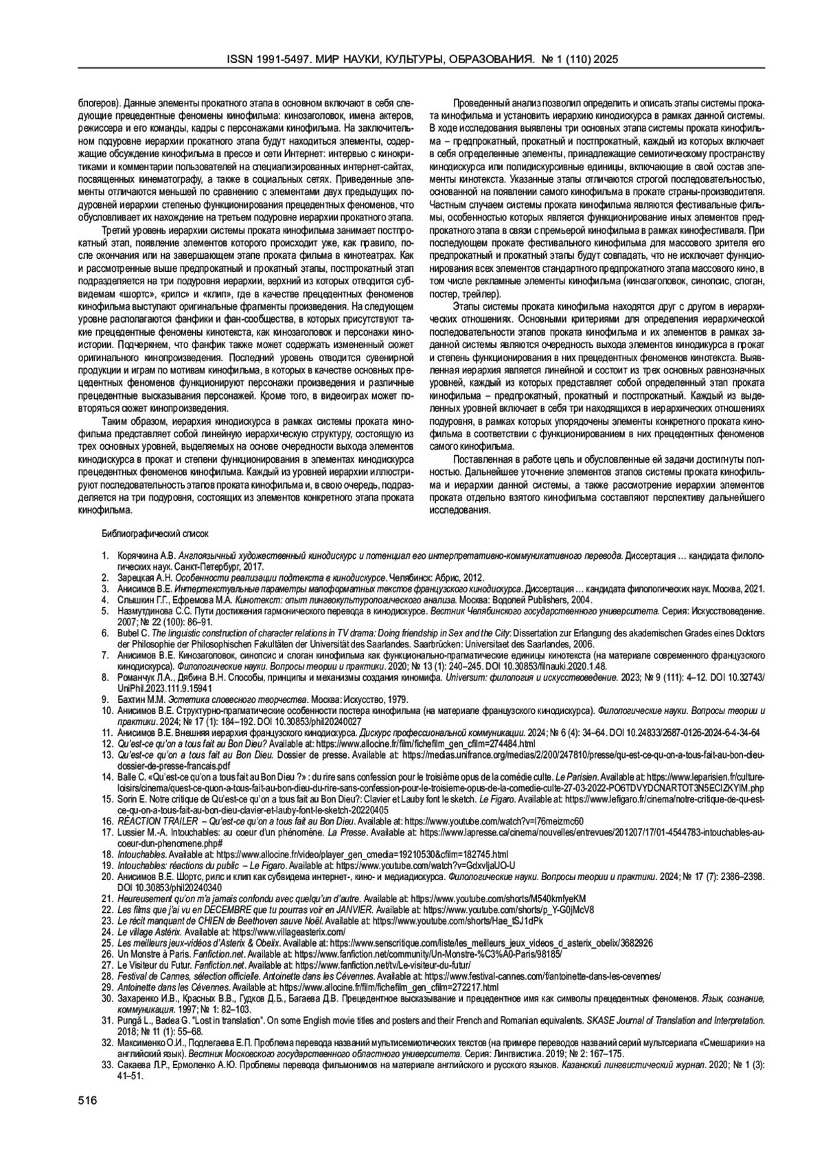 11. 	Анисимов В.Е. Внешняя иерархия французского кинодискурса. Дискурс профессиональной коммуникации. 2024; № 6 (4): 34-64. DOI: 10.24833/2687-0126-2024-6-4-34-64 EDN: BMPNXA