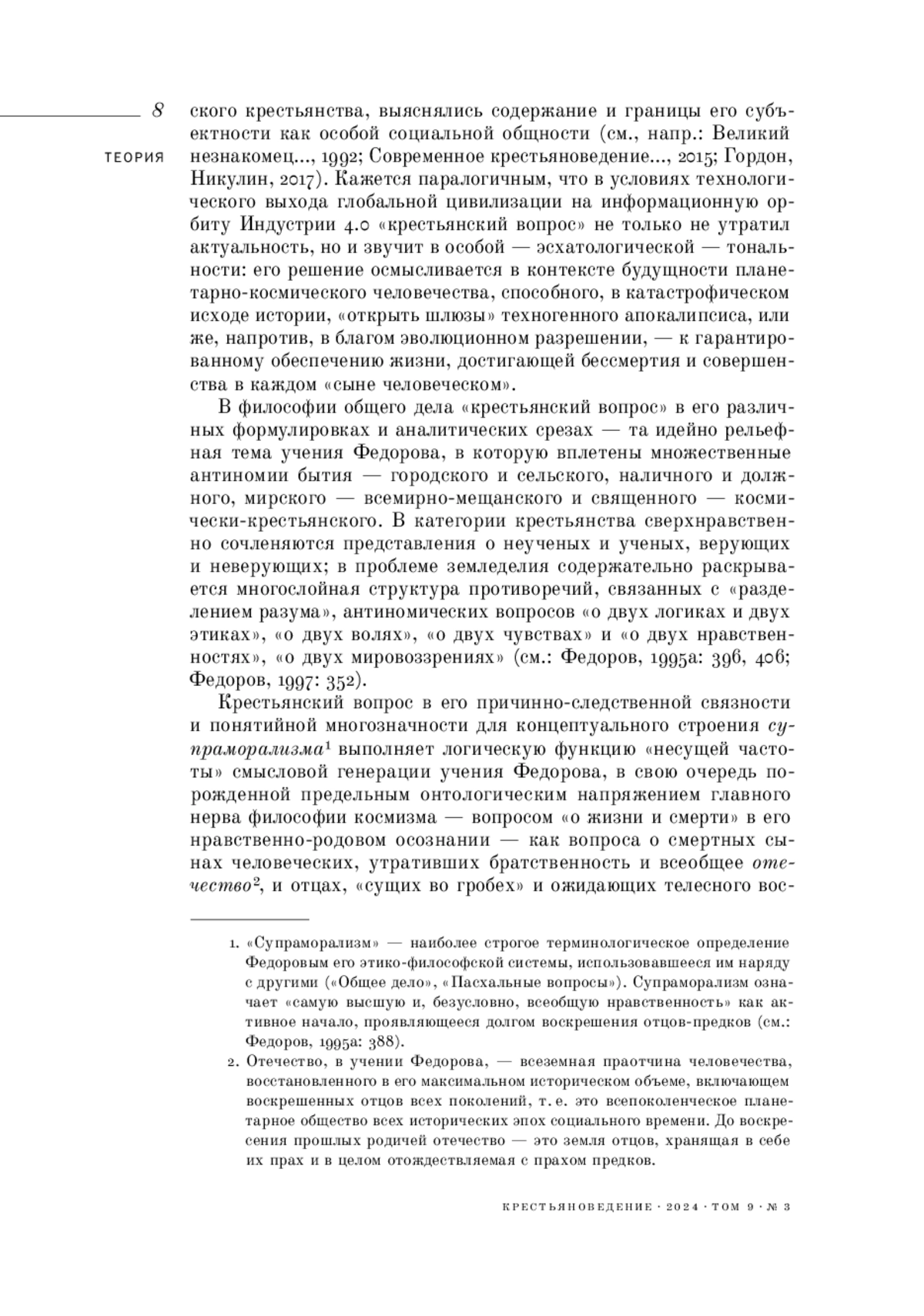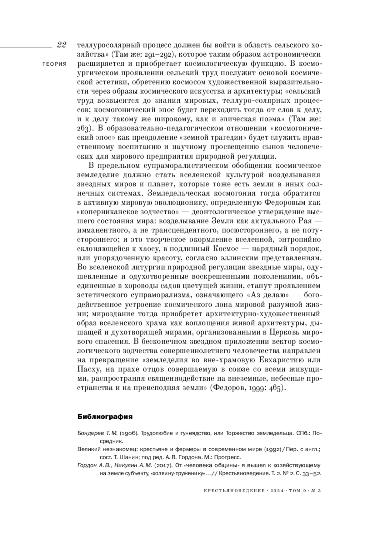 На протяжении минувших почти полутора столетий крестьянская тема периодически вызывала и продолжает вызывать волны дискуссий, в ходе которых определялись черты идентичности российского крестьянства, выяснялись содержание и границы его субъектности как особой социальной общности (см., напр.: Великий незнакомец…, 1992; Современное крестьяноведение…, 2015; Гордон, Никулин, 2017). Кажется паралогичным, что в условиях технологического выхода глобальной цивилизации на информационную орбиту Индустрии 4.0 «крестьянский вопрос» не только не утратил актуальность, но и звучит в особой — эсхатологической — тональности: его решение осмысливается в контексте будущности планетарно-космического человечества, способного, в катастрофическом исходе истории, «открыть шлюзы» техногенного апокалипсиса, или же, напротив, в благом эволюционном разрешении, — к гарантированному обеспечению жизни, достигающей бессмертия и совершенства в каждом «сыне человеческом».