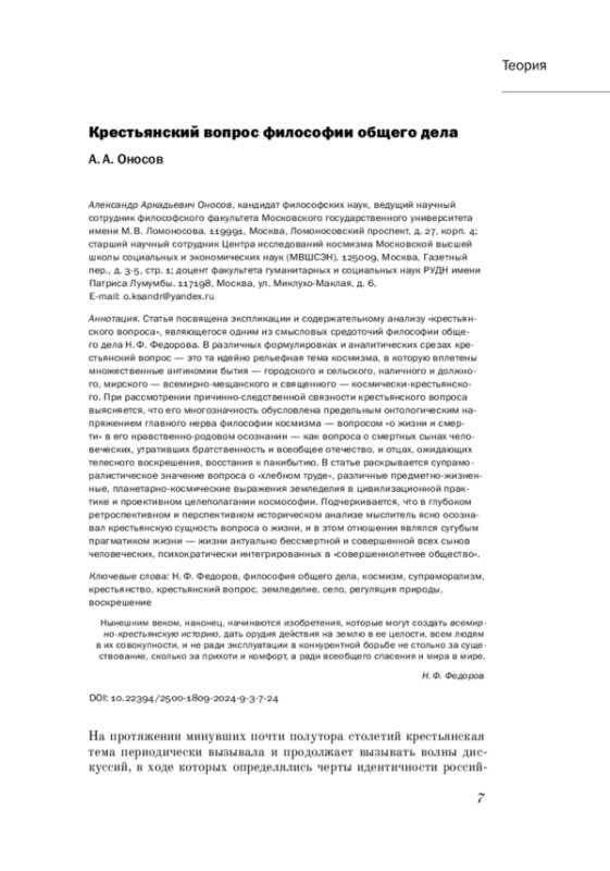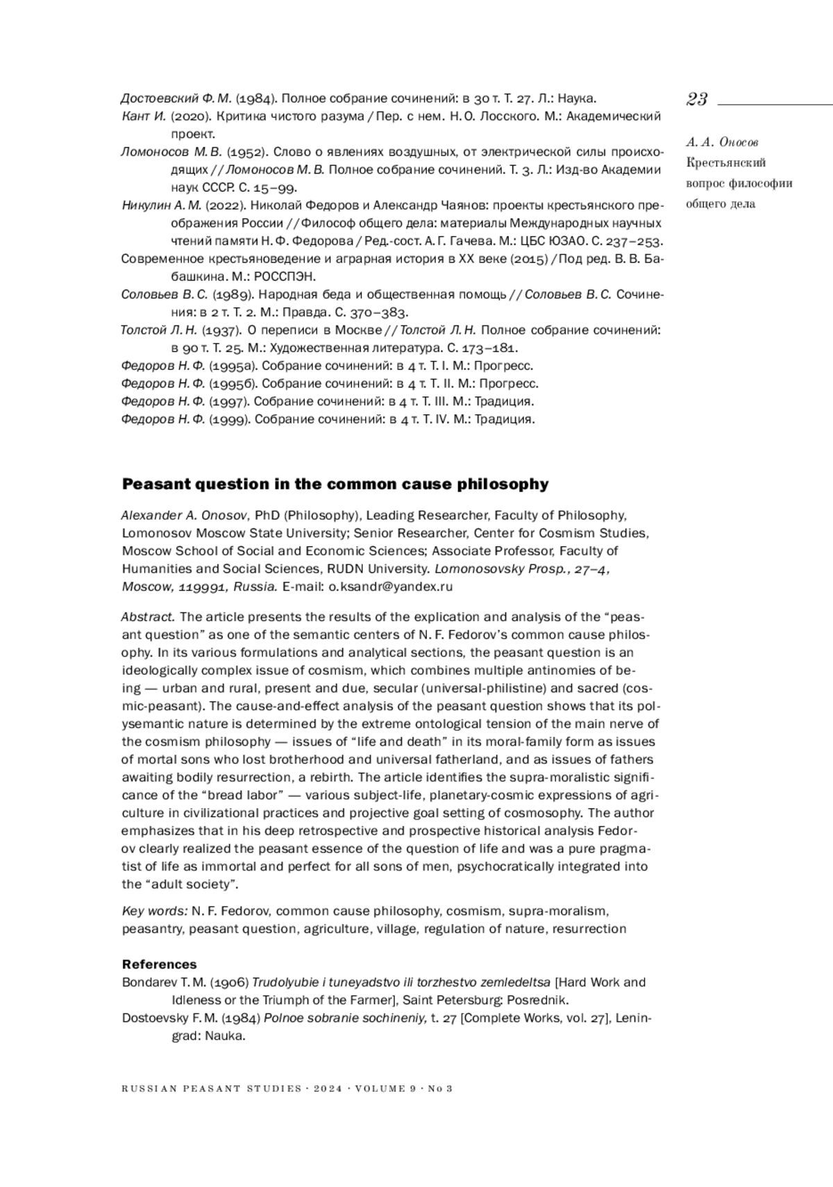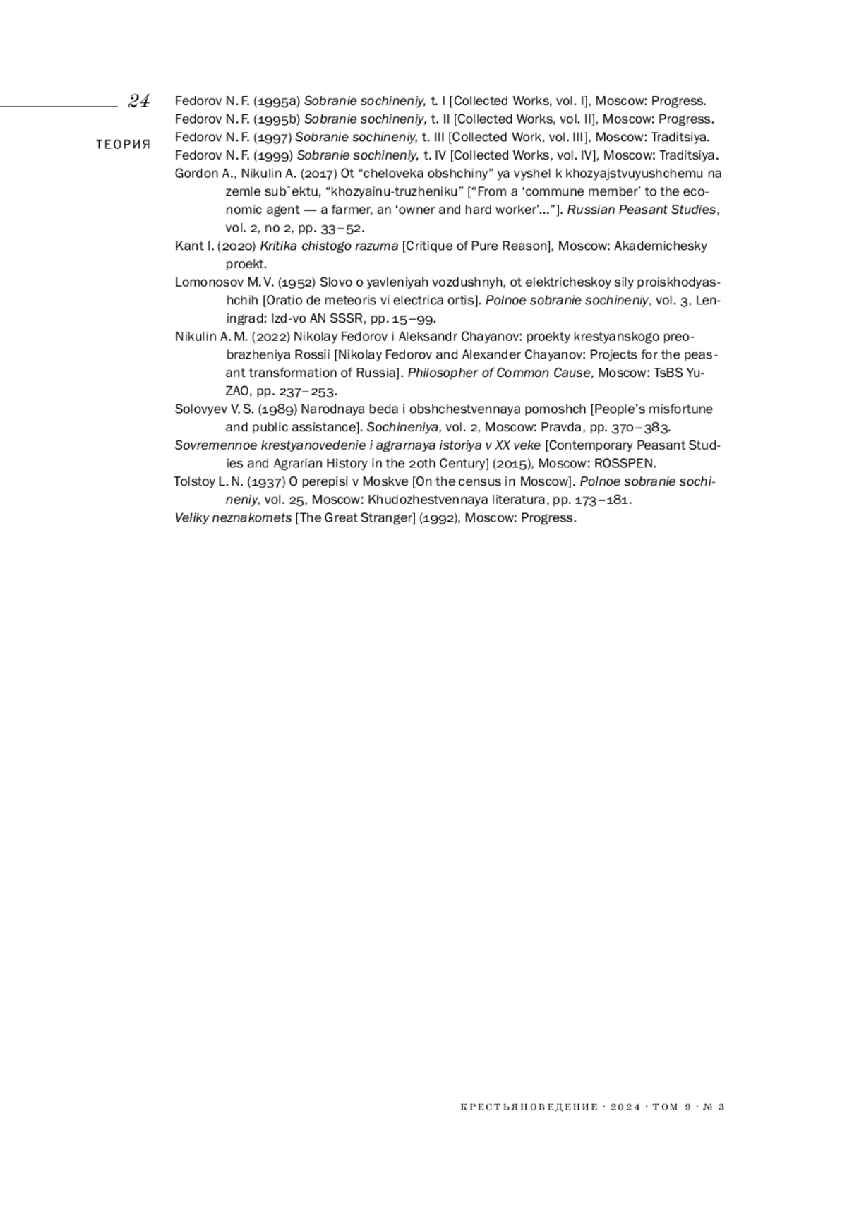 7. 	Никулин А. М. (2022). Николай Федоров и Александр Чаянов: проекты крестьянского преображения России // Философ общего дела: материалы Международных научных чтений памяти Н. Ф. Федорова / Ред.-сост. А. Г. Гачева. М.: ЦБС ЮЗАО. С. 237-253.  EDN: NMAEII