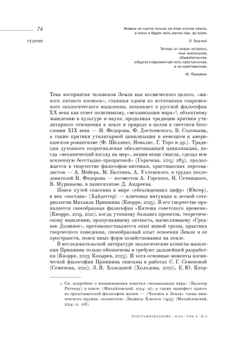 Тема восприятия человеком Земли как космического целого, «живого личного космоса», ставшая одним из источников современного экологического мышления, возникает в русской философии XX века как ответ позитивизму, «механизации мира»1, объектному мышлению в культуре и науке, продолжая традицию критики утилитарного отношения к земле и природе в целом в светском богословии XIX века — Н. Федорова, Ф. Достоевского, В. Соловьева, а также критики утилитарной цивилизации в немецком и американском романтизме (Ф. Шеллинг, Новалис, Г. Торо и др.). Традиция духовного сопротивления обезличивающей цивилизации, когда «механический взгляд на мир», лишив вещи смысла, сделал всю вселенную бесстыдно-прозрачной» (Горичева, 2015: 285), продолжается в творчестве философов-китежан, христианских персоналистов — А. Мейера, М. Бахтина, А. Ухтомского, в трудах последователей Н. Федорова — космистов А. Горского, Н. Сетницкого, В. Муравьева, в панпсихизме Д. Андреева