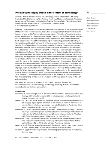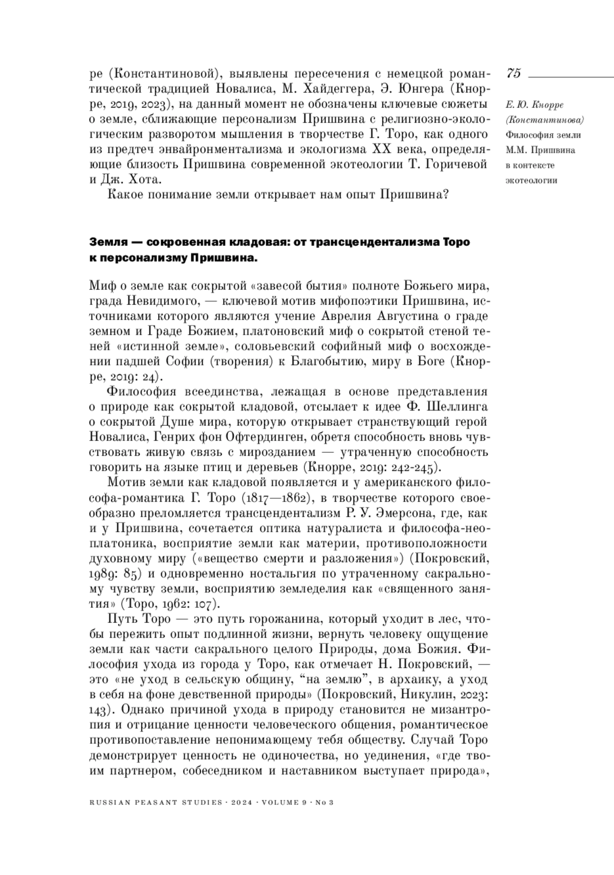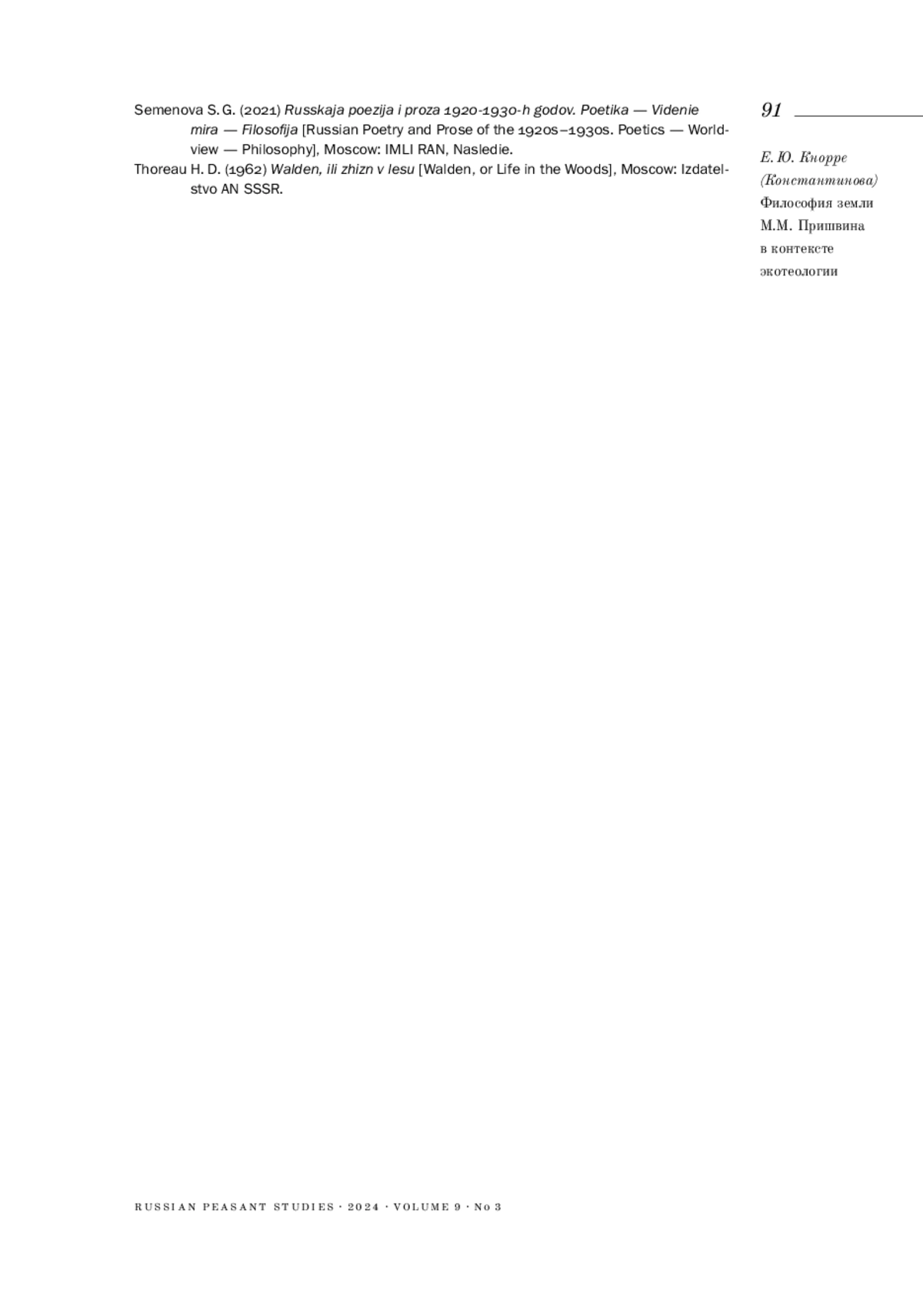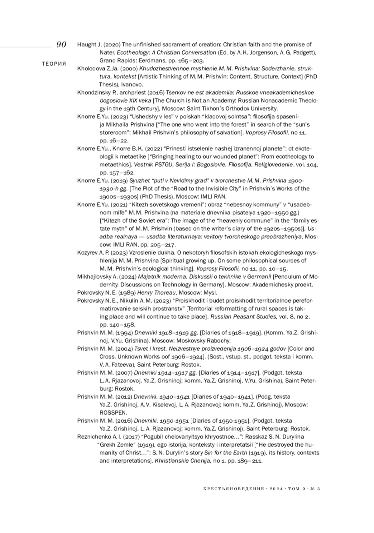 7. 	Кнорре Е. Ю. (2023). “Ушедший в Лес” в поисках “кладовой солнца”: философия спасения Михаила Пришвина // Вопросы философии. № 11. С. 16-22.  EDN: FEWYEA