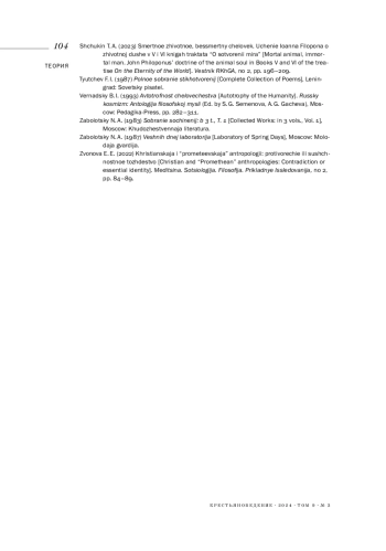 26. 	Щукин Т. А. (2023). Смертное животное, бессмертный человек. Учение Иоанна Филопона о животной душе в V и VI книгах трактата “О сотворении мира” // Вестник Русской христианской гуманитарной академии Т. 24. № 2. С. 196-209.  EDN: GZCTRR