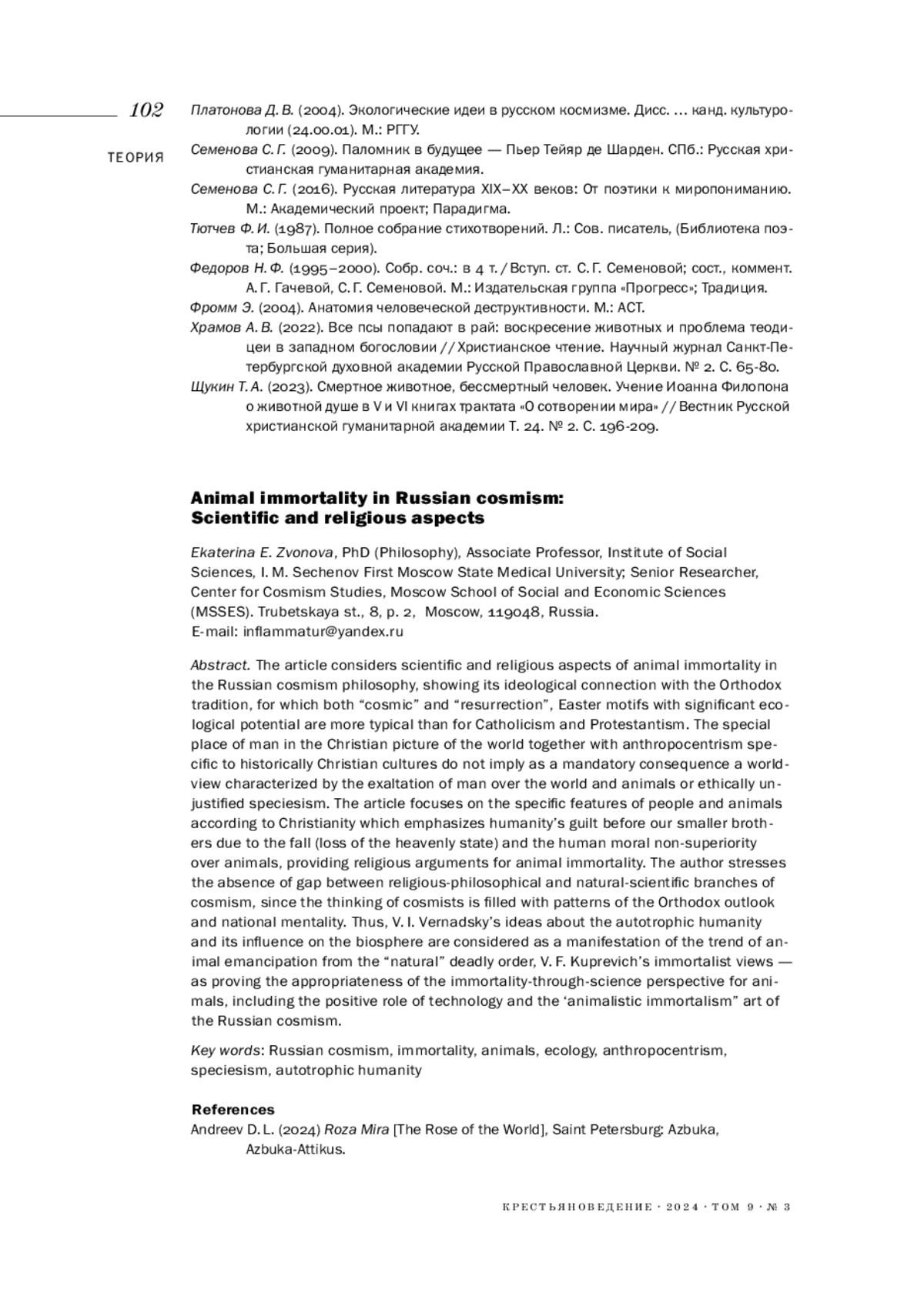 25. 	Храмов A. В. (2022). Все псы попадают в рай: воскресение животных и проблема теодицеи в западном богословии // Христианское чтение. Научный журнал Санкт-Петербургской духовной академии Русской Православной Церкви. № 2. С. 65-80.  EDN: EAOSWW