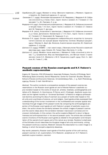Статья посвящена сравнительному анализу темы крестьянского космоса в искусстве русского авангарда и идей эстетического супраморализма Николая Федоровича Федорова. Эстетический супраморализм как высшая нравственность или «Всеобщий синтез» - религиозно-философское учение Федорова, автора идеи космизма как проекта миропорядка, основанного на всеединстве, синтезе науки, искусства, религии. В образах крестьянского мира художники авангарда (К. Малевич, Н. Гончарова, П. Филонов, В. Чекрыгин) выразили свое понимание модуса человеческой сопричастности многогранным и сложным пространственным отношениям. Сопоставление антропологической проекции искусства русского авангарда с проектом эстетического супраморализма Федорова позволяет увидеть созвучность художественных образов крестьянского космоса идеям космизма о соотнесенности макрокосма (Вселенной) и микрокосма (человека). В этом контексте интерпретируется феномен возвращения к фигуративности и антропоцентричности второго крестьянского цикла Малевича. Отдельный предмет рассмотрения - космические интуиции русского авангарда, связанные с опытом восприятия и осмысления сакрального пространства храма. Природа понимается как храм. Экфрасис православного храма у Федорова описывает литургический образ всеединства, родства, соединяющего крестьянский мир как космос. Малевич сводит описание к цветовому образу, ощущению, в которых растворяется предметность храма.
