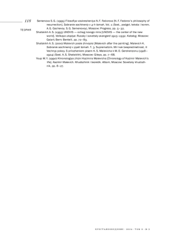 15. 	Семенова С. Г. (1995). Философия воскрешения Н. Ф. Федорова // Федоров Н. Ф. Собрание сочинений в 4-х томах / Сост., подгот. текста и коммент. А. Г. Гачевой, С. Г. Семеновой. Т. 1. М.: Прогресс. С. 5-32.  EDN: ORYVFB