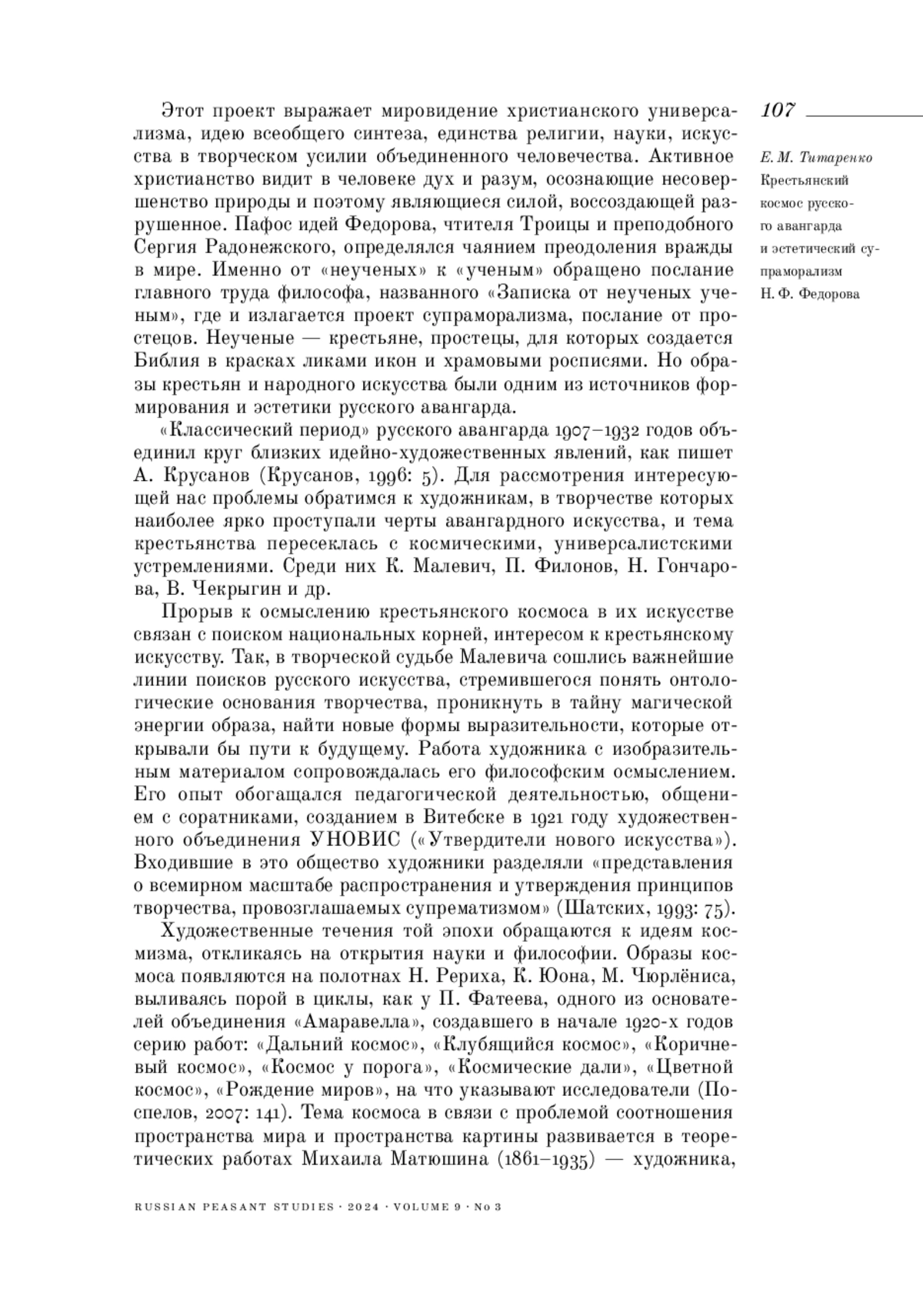Тема крестьянства и образы крестьянского космоса нашли своеобразное и глубокое воплощение в искусстве русского авангарда. Это вызывает интерес не только с искусствоведческой точки зрения, но и с позиции историко-культурологического рассмотрения. В образах крестьянского мира художники выразили мифоантропологическую проекцию искусства авангарда, отразившего историю культурной трансформации крестьянской страны.
