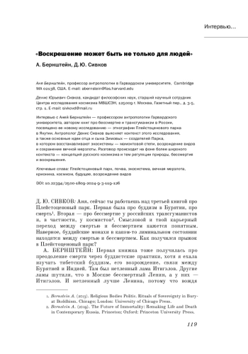 Д. Ю. СИВКОВ: Аня, сейчас ты работаешь над третьей книгой про Плейстоценовый парк. Первая была про буддизм в Бурятии, про смерть1. Вторая — про бессмертие у российских трансгуманистов и, в частности, у космистов2. Смысловой и твой карьерный переход между смертью и бессмертием кажется понятным. Наверное, буддийские монахи в каком-то лиминальном состоянии находятся между смертью и бессмертием. Как получился прыжок в Плейстоценовый парк?