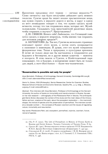 Интервью с Аней Бернштейн - профессором антропологии Гарвардского университета, автором книг про бессмертие и трансгуманизм в России, посвящено ее новому исследованию - этнографии Плейстоценового парка в Якутии. Антрополог Денис Сивков выясняет контекст этого исследования, а также основные идеи отца и сына Зимовых - создателей Парка, в котором восстанавливают экосистемы - мамонтовой степи, возрождение видов и сохранение вечной мерзлоты. Разговор происходит на фоне более широкого контекста - концепций русского космизма и тем регуляции природы, бессмертия и воскрешения.