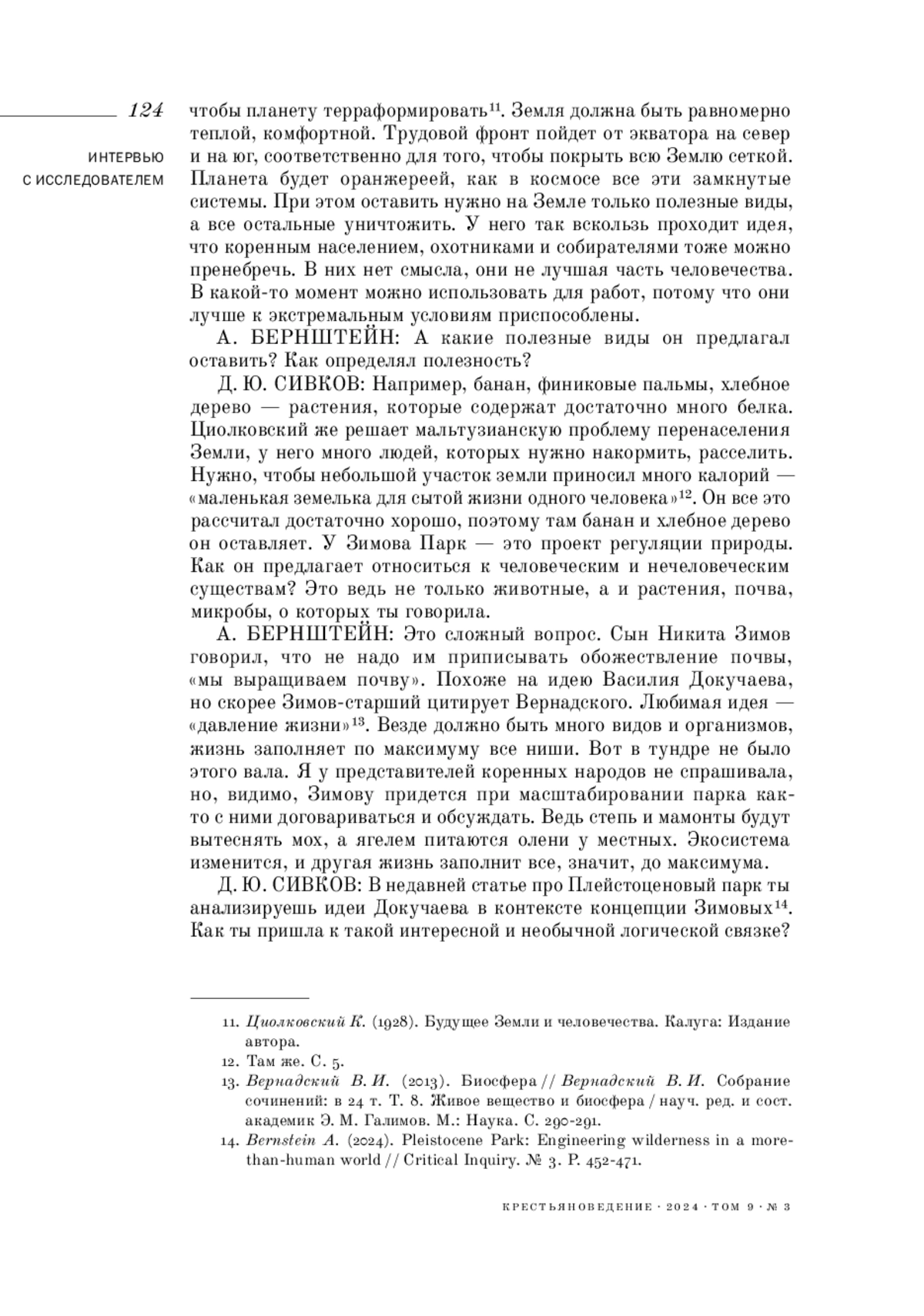 13. 	Bernstein A. (2024). Pleistocene Park: Engineering wilderness in a morethan-human world // Critical Inquiry. № 3. P. 452-471.  EDN: GYTOXU
