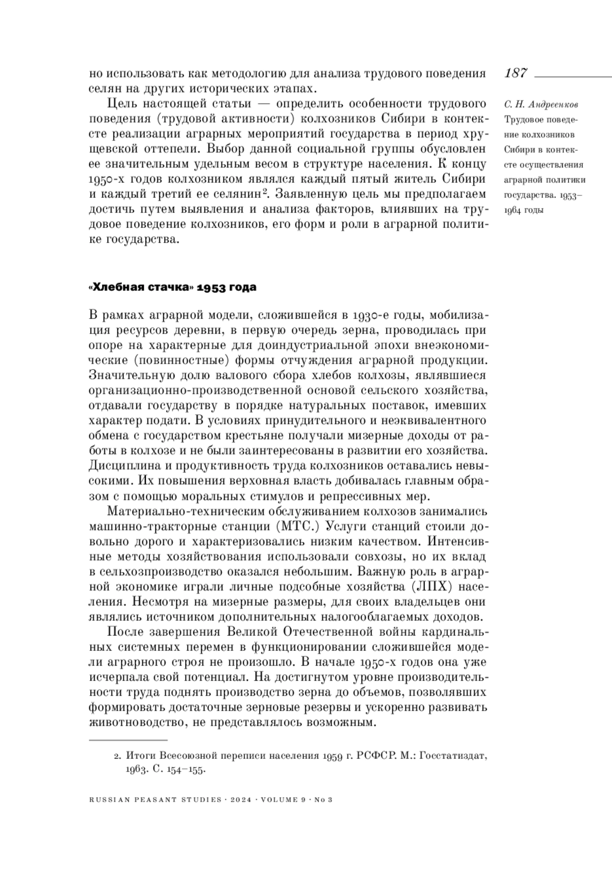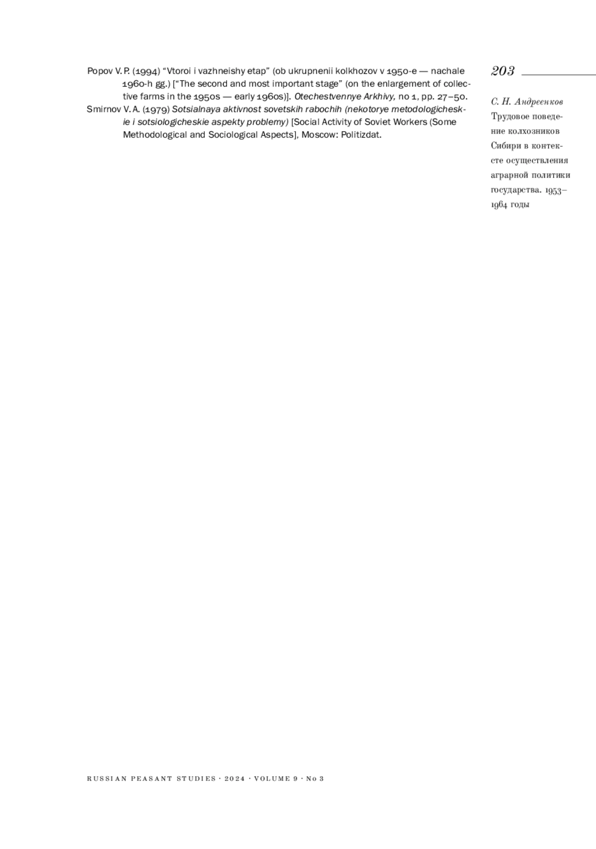 1. Андреенков С. Н. (2016). Колхозно-совхозная система в Сибири в 1946-1964 гг.: функционирование и реформирование. Новосибирск: Сибпринт. EDN: WWZGVX